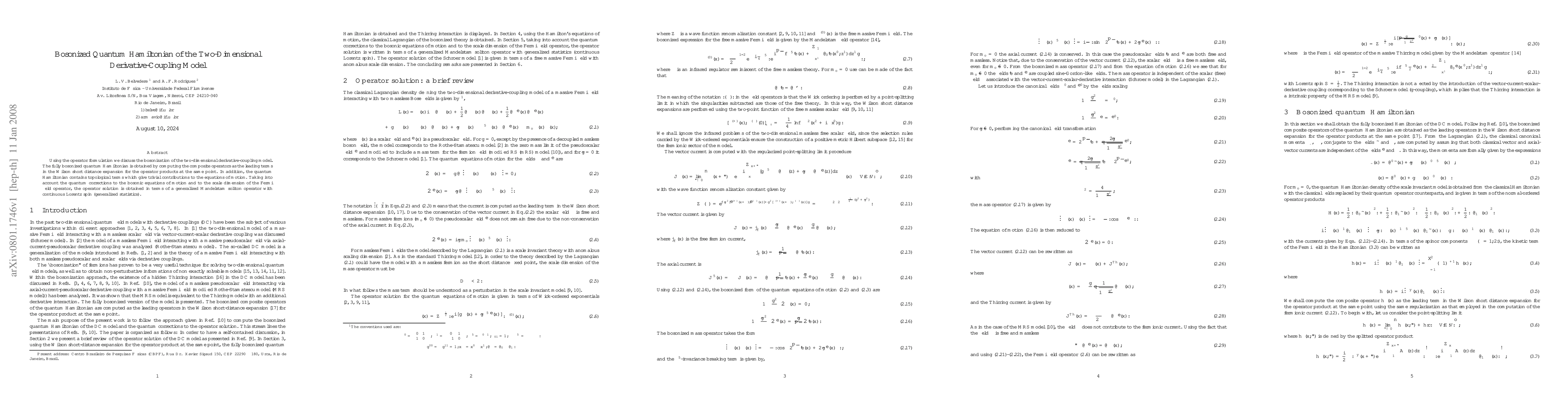 Using the operator formulation we discuss the bosonization of the two-dimensional derivative-coupling model. The fully bosonized quantum Hamiltonian is obtained by computing the composite operators as the leading terms in the Wilson short distance expansion for the operator products at the same point. In addition, the quantum Hamiltonian contains topological terms which give trivial contributions to the equations of motion. Taking into account the quantum corrections to the bosonic equations of motion and to the scale dimension of the Fermi field operator, the operator solution is obtained in terms of a generalized Mandelstam soliton operator with continuous Lorentz spin (generalized statistics).