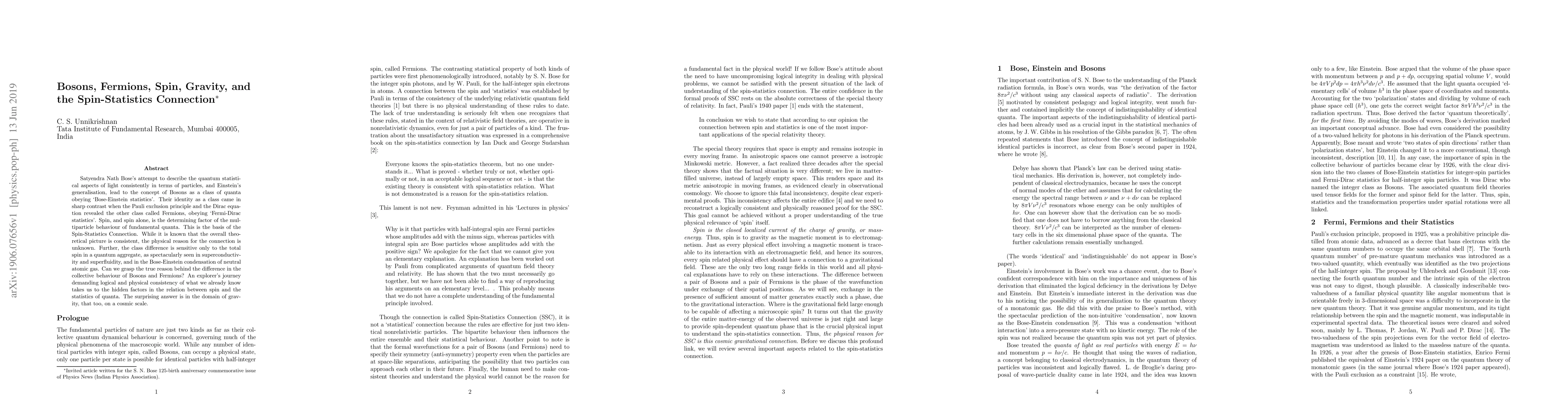 Satyendra Nath Bose's attempt to describe the quantum statistical aspects of light consistently in terms of particles, and Einstein's generalisation, lead to the concept of Bosons as a class of quanta obeying `Bose-Einstein statistics'. Their identity as a class came in sharp contrast when the Pauli exclusion principle and the Dirac equation revealed the other class called Fermions, obeying `Fermi-Dirac statistics'. Spin, and spin alone, is the determining factor of the multiparticle behaviour of fundamental quanta. This is the basis of the Spin-Statistics Connection. While it is known that the overall theoretical picture is consistent, the physical reason for the connection is unknown. Further, the class difference is sensitive only to the total spin in a quantum aggregate, as spectacularly seen in superconductivity and superfluidity, and in the Bose-Einstein condensation of neutral atomic gas. Can we grasp the true reason behind the difference in the collective behaviour of Bosons and Fermions? An explorer's journey demanding logical and physical consistency of what we already know takes us to the hidden factors in the relation between spin and the statistics of quanta. The surprising answer is in the domain of gravity, that too, on a cosmic scale.