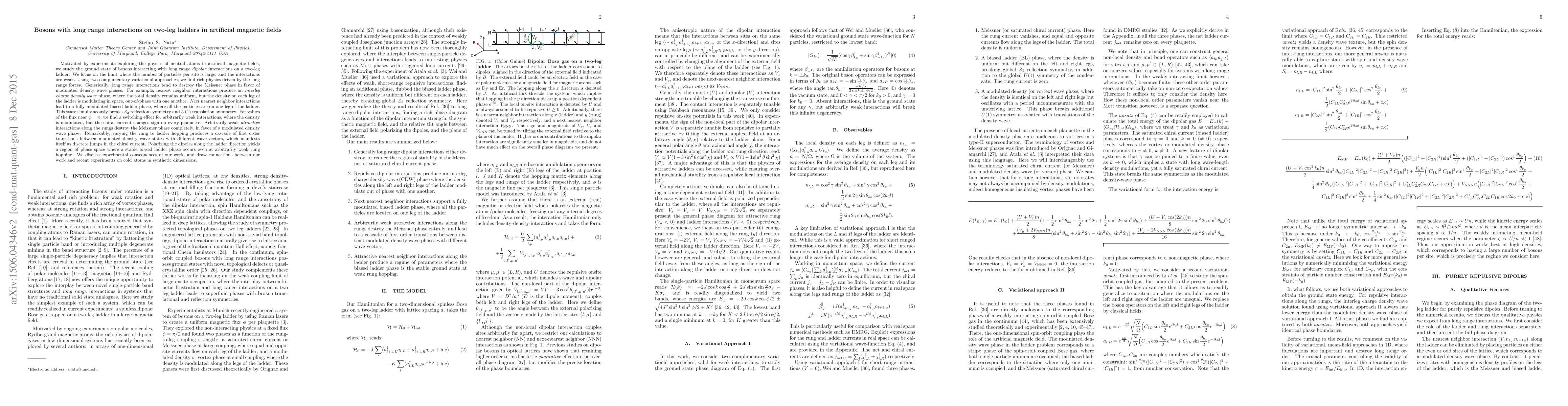 Motivated by experiments exploring the physics of neutral atoms in artificial magnetic fields, we study the ground state of bosons interacting with long range dipolar interactions on a two-leg ladder. Using two complimentary variational approaches, valid for weak interactions, we find rich physics driven by the long range forces. Generically, long range interactions tend to destroy the Meissner phase in favor of modulated density wave phases. Nearest neighbor interactions produce a novel interleg charge density wave phase, where the total density remains uniform, but the density on each leg of the ladder is modulating in space, out-of-phase with one another. At weak magnetic fields, next nearest neighbor interactions lead to a fully modulated biased ladder phase, where all the particles are on one leg of the ladder, and the density is modulating in space. This state simultaneously breaks $Z_{2}$ reflection symmetry and $U(1)$ symmetry associated with translation in real space. For values of the flux near $\phi = \pi$, we find that a switching effect occurs for arbitrarily weak interactions, where the density modulates in space, but the chiral current changes sign on every plaquette. Arbitrarily weak attractive interactions along the rungs destroy the Meissner phase completely, in favor of a modulated density wave phase. Varying magnetic field produces a cascade of first order transitions between modulated density wave states with different wave-vectors, which manifests itself as discrete jumps in the chiral current. Polarizing the dipoles along the ladder direction yields a region of phase space where a stable biased ladder phase occurs even at arbitrarily weak magnetic fields. We discuss the experimental consequences of our work, in particular, how the interleg charge density wave can manifest itself in recent experiments on bosons in synthetic dimensions.