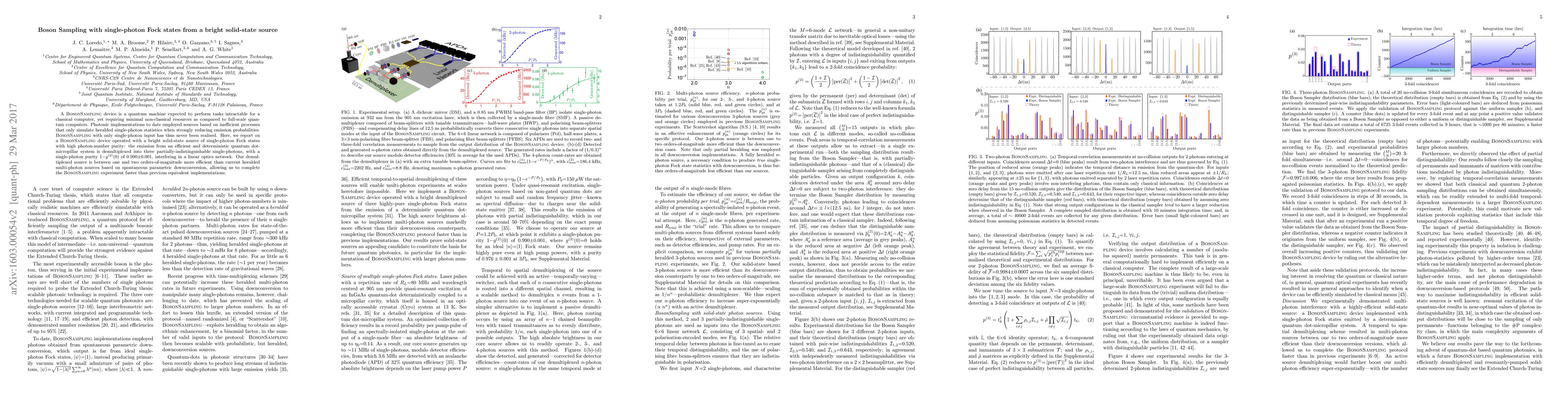 The paper presents a BosonSampling device utilizing a bright solid-state source that efficiently generates high-purity single-photon Fock states from a quantum dot-micropillar system, achieving a photon purity of 0.990±0.001. This setup enables faster and more efficient BosonSampling experiments compared to previous multi-photon sources.