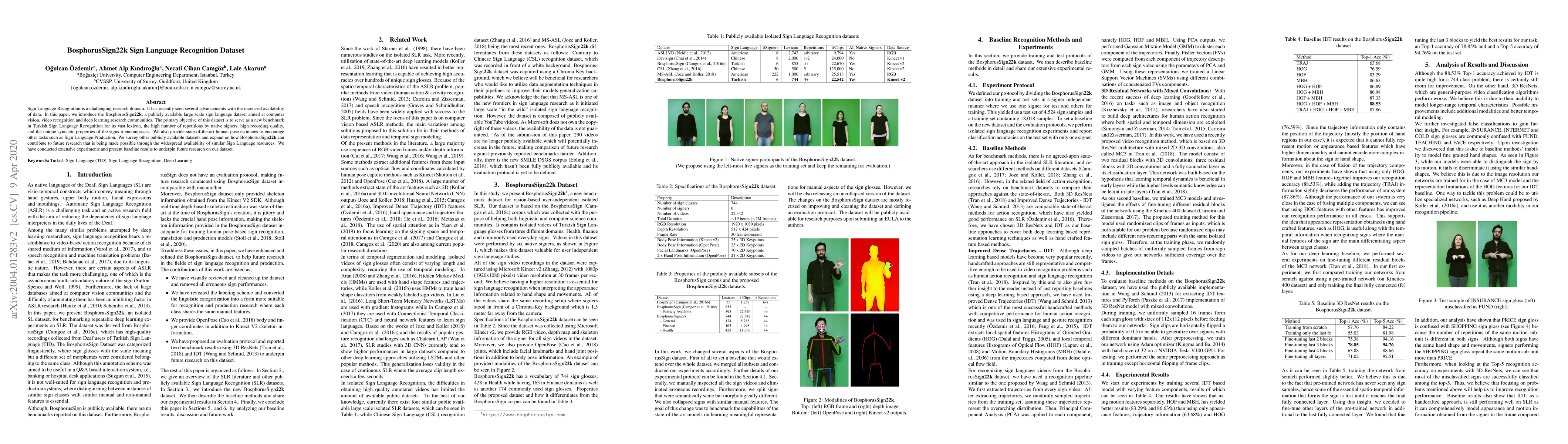 The BosphorusSign22k dataset introduces a large-scale resource for Turkish Sign Language recognition, featuring high-quality recordings and extensive pose estimates to support computer vision and deep learning research. The dataset aims to establish a new benchmark for sign language recognition and includes extensive experiments to validate its utility.