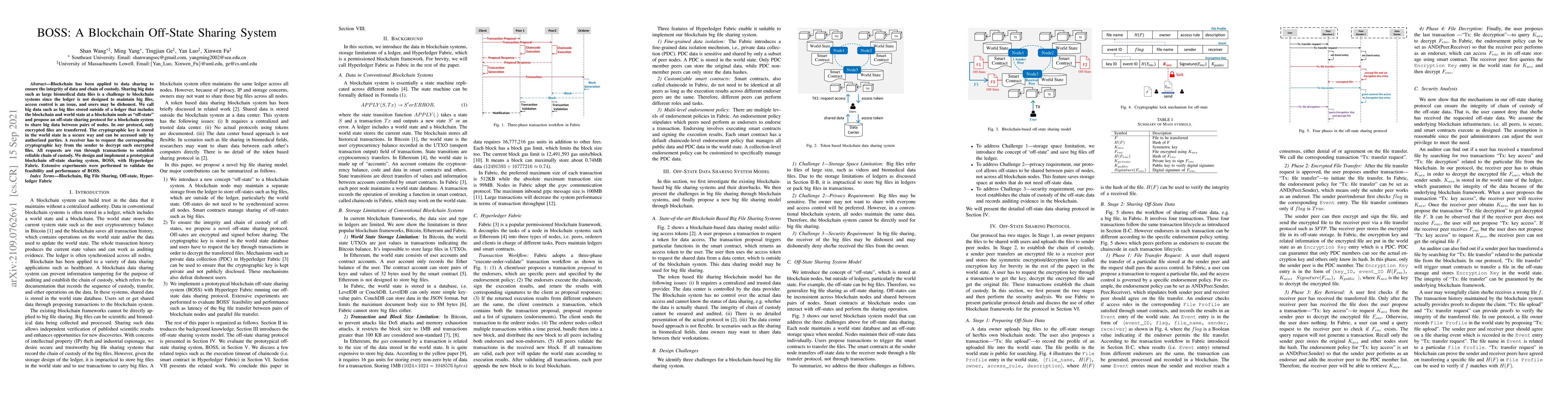 A blockchain-based system called BOSS enables secure sharing of large files between nodes, ensuring integrity and chain of custody through encrypted transfers and transaction-based requests.