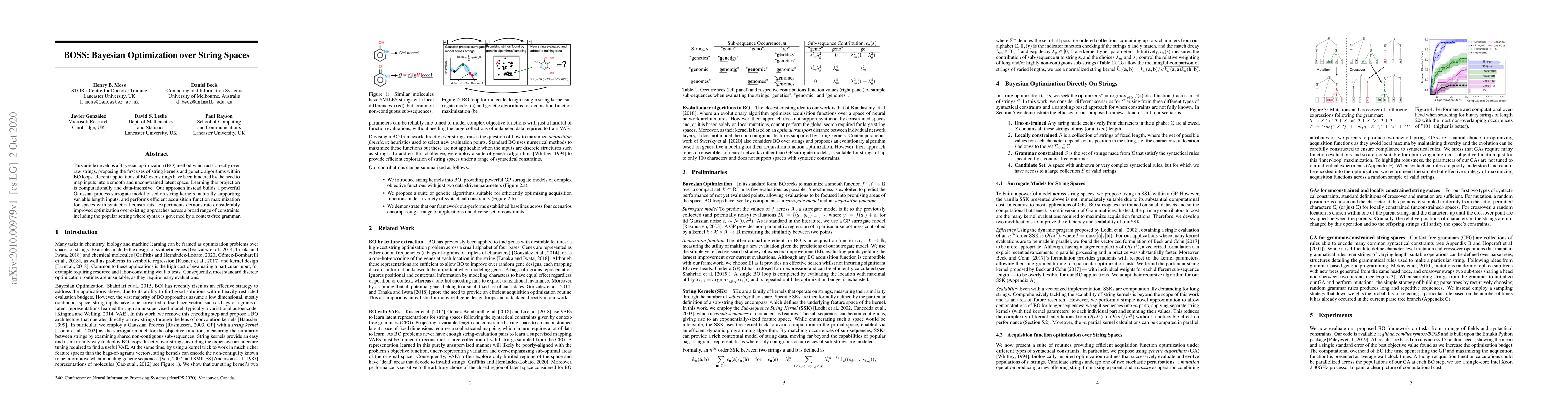 This paper introduces a Bayesian optimization method for string spaces using string kernels and genetic algorithms, eliminating the need for complex input mappings. It demonstrates superior performance over existing methods in optimizing syntactically constrained string spaces.