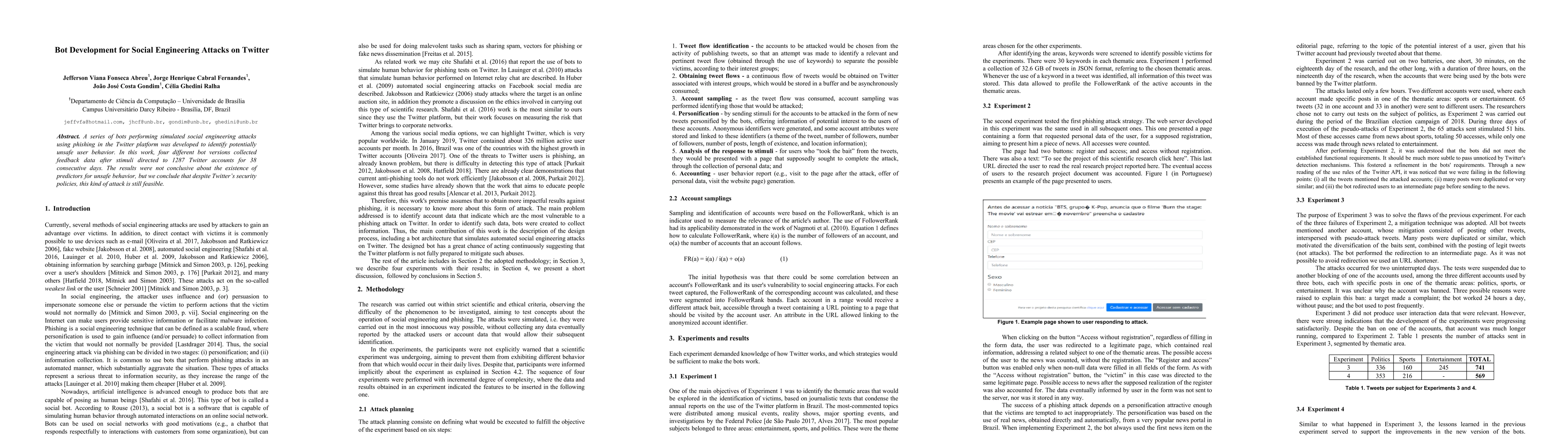 A series of bots performing simulated social engineering attacks using phishing in the Twitter platform was developed to identify potentially unsafe user behavior. In this work different bot versions were developed to collect feedback data after stimuli directed to 1,287 twitter accounts for 38 consecutive days. The results were not conclusive about the existence of preceptors for unsafe behavior, but we conclude that despite Twiter's security this kind of attack is still feasible.