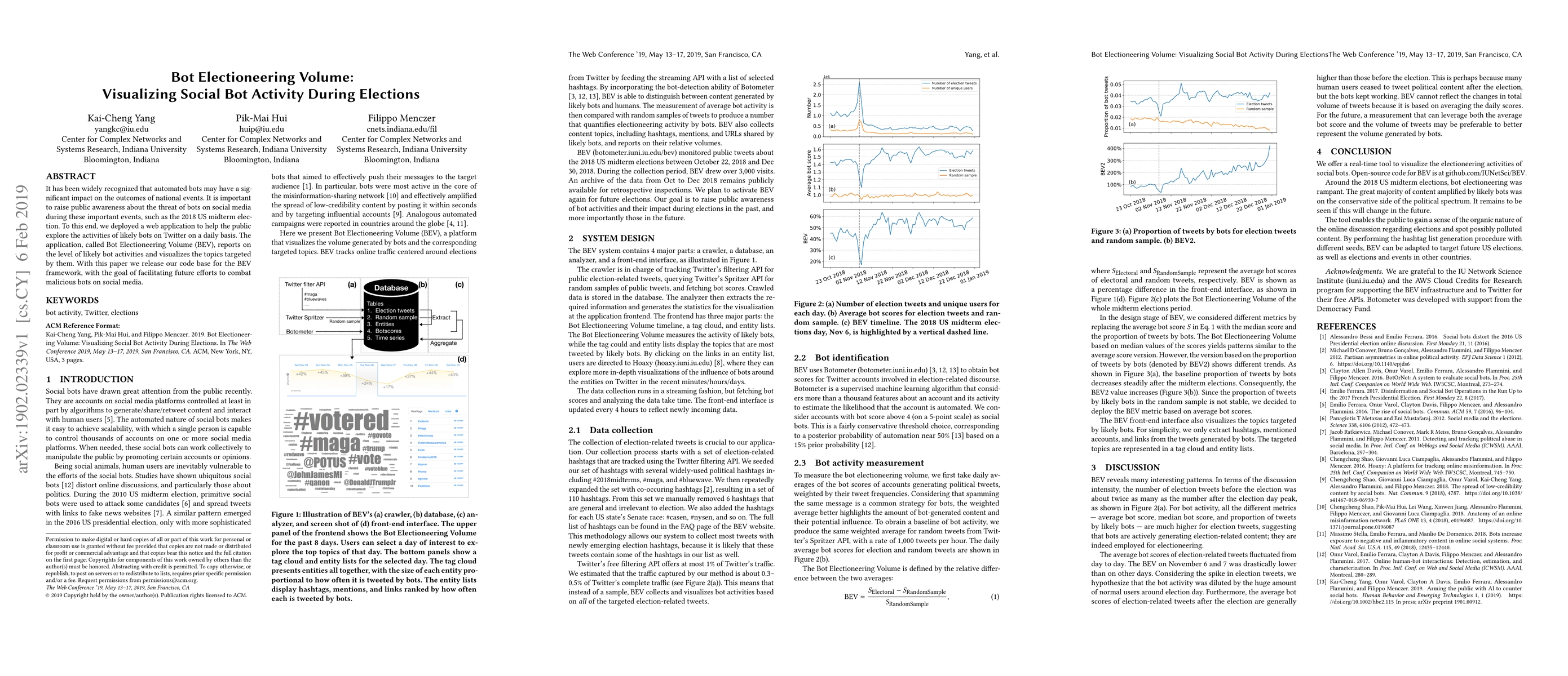 It has been widely recognized that automated bots may have a significant impact on the outcomes of national events. It is important to raise public awareness about the threat of bots on social media during these important events, such as the 2018 US midterm election. To this end, we deployed a web application to help the public explore the activities of likely bots on Twitter on a daily basis. The application, called Bot Electioneering Volume (BEV), reports on the level of likely bot activities and visualizes the topics targeted by them. With this paper we release our code base for the BEV framework, with the goal of facilitating future efforts to combat malicious bots on social media.