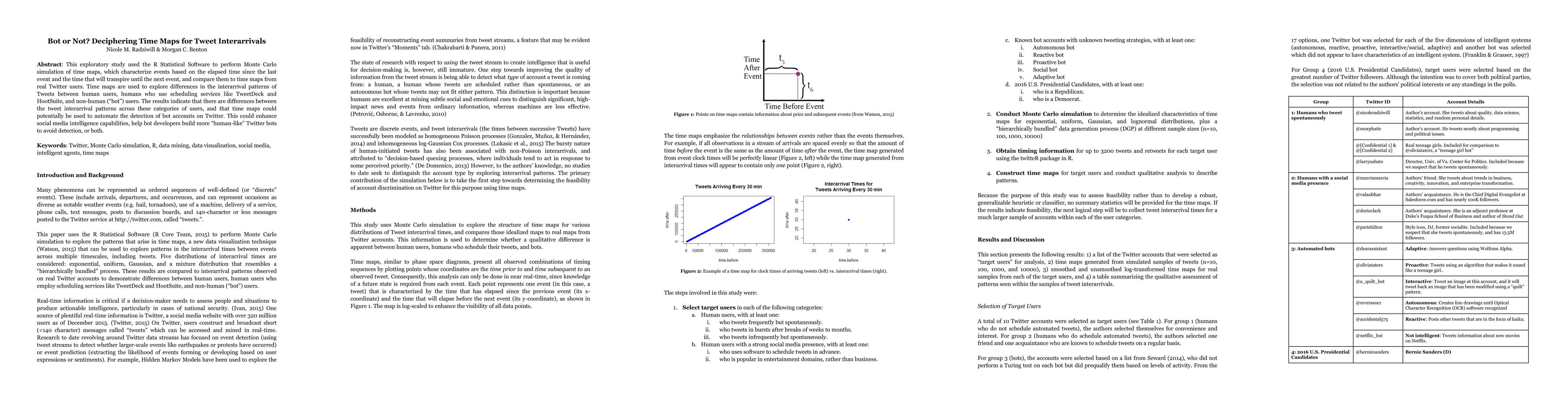 This study uses Monte Carlo simulations in R to analyze time maps of Twitter interarrivals, distinguishing patterns among human, scheduled service, and bot users. Results suggest time maps can automate bot detection, impacting social media intelligence and bot development.