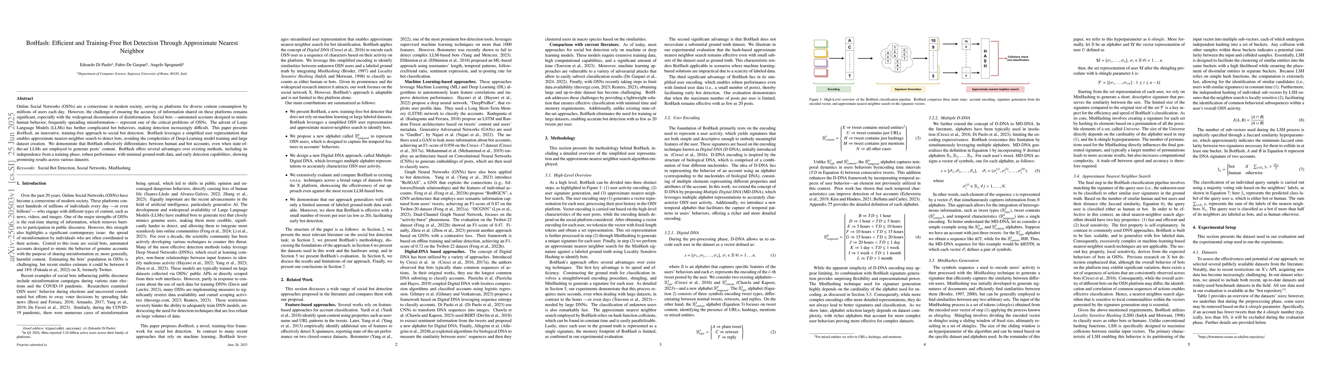 Online Social Networks (OSNs) are a cornerstone in modern society, serving as platforms for diverse content consumption by millions of users each day. However, the challenge of ensuring the accuracy of information shared on these platforms remains significant, especially with the widespread dissemination of disinformation. Social bots -- automated accounts designed to mimic human behavior, frequently spreading misinformation -- represent one of the critical problems of OSNs. The advent of Large Language Models (LLMs) has further complicated bot behaviors, making detection increasingly difficult. This paper presents BotHash, an innovative, training-free approach to social bot detection. BotHash leverages a simplified user representation that enables approximate nearest-neighbor search to detect bots, avoiding the complexities of Deep-Learning model training and large dataset creation. We demonstrate that BotHash effectively differentiates between human and bot accounts, even when state-of-the-art LLMs are employed to generate posts' content. BotHash offers several advantages over existing methods, including its independence from a training phase, robust performance with minimal ground-truth data, and early detection capabilities, showing promising results across various datasets.