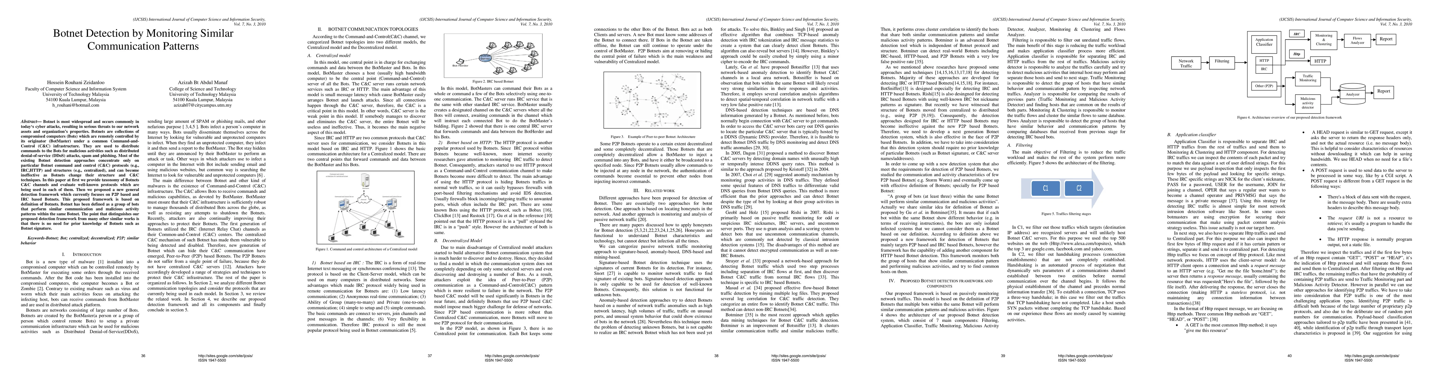 This paper proposes a novel botnet detection framework that identifies botnets by monitoring similar communication patterns among compromised computers, without requiring prior knowledge of botnet signatures. The framework focuses on detecting P2P and IRC-based botnets by analyzing their communication behaviors.