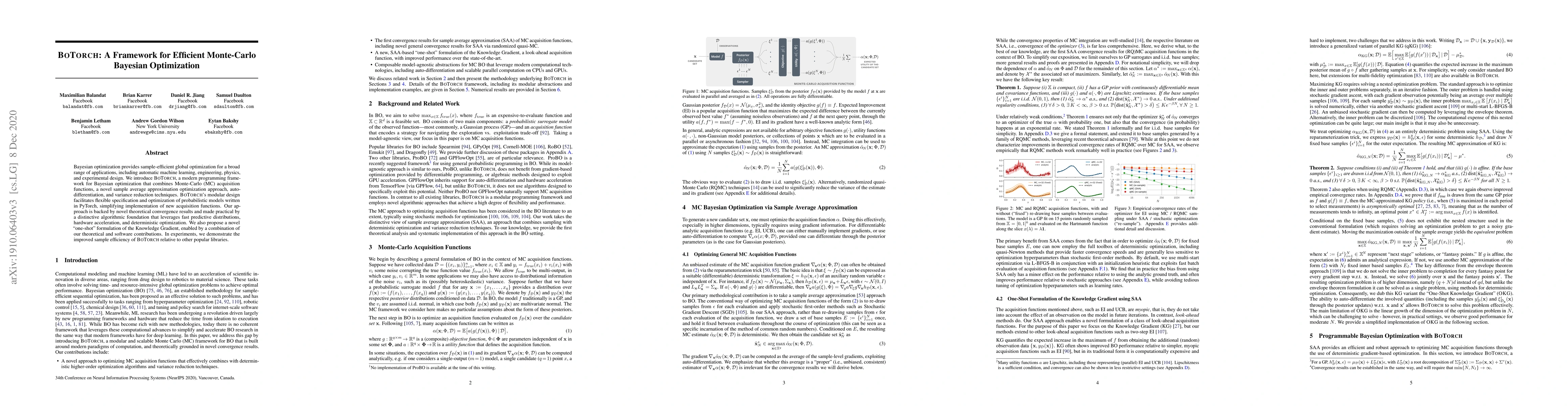 BoTorch's technical contributions include the combination of Monte-Carlo acquisition functions with a novel sample average approximation optimization approach, auto-differentiation, and variance reduction techniques, all integrated within a flexible and efficient PyTorch-based framework.