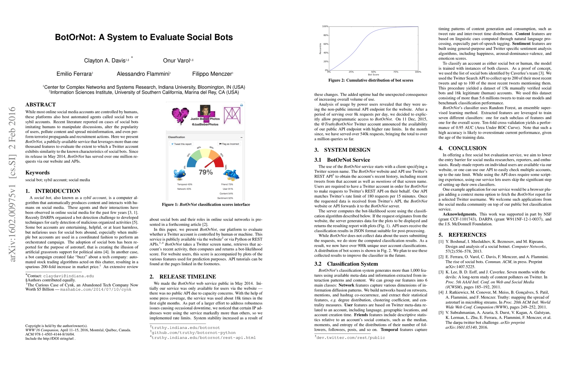 While most online social media accounts are controlled by humans, these platforms also host automated agents called social bots or sybil accounts. Recent literature reported on cases of social bots imitating humans to manipulate discussions, alter the popularity of users, pollute content and spread misinformation, and even perform terrorist propaganda and recruitment actions. Here we present BotOrNot, a publicly-available service that leverages more than one thousand features to evaluate the extent to which a Twitter account exhibits similarity to the known characteristics of social bots. Since its release in May 2014, BotOrNot has served over one million requests via our website and APIs.