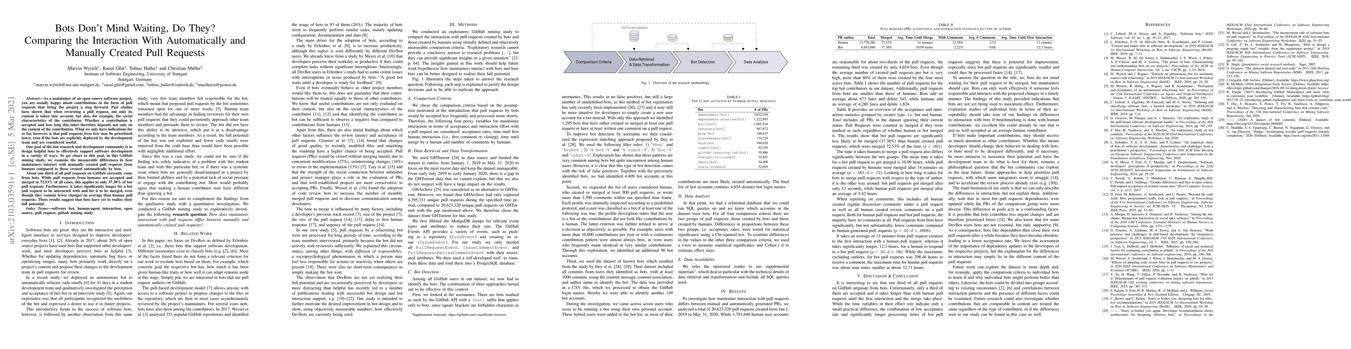 This study compares the interaction between maintainers and pull requests created by humans versus bots on GitHub, revealing that bot-generated pull requests are accepted and merged significantly less often and take longer to interact with, despite containing fewer changes. The findings suggest that bots have not yet fully realized their potential in supporting software development.