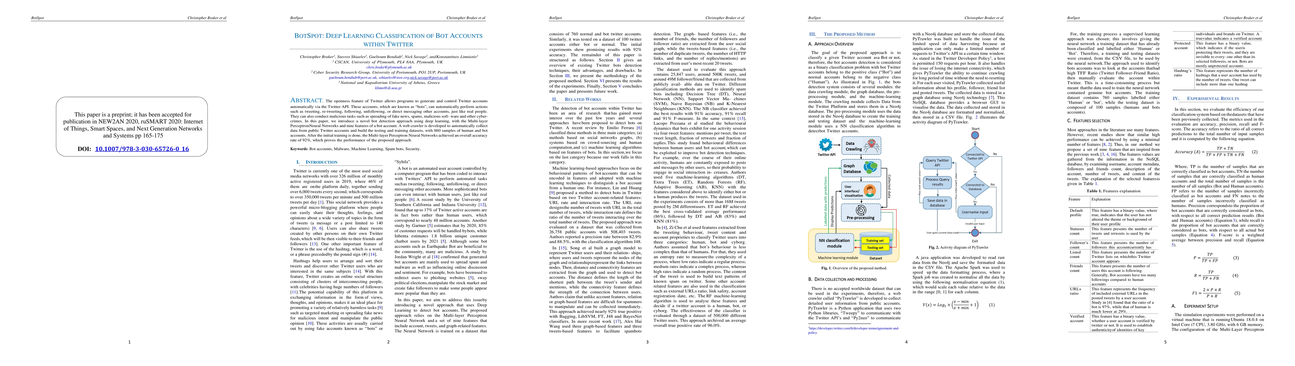 This paper proposes a deep learning method using Multi-layer Perceptron Neural Networks to classify bot accounts on Twitter, employing nine features for detection. The approach achieved an overall accuracy rate of 92% in distinguishing bot accounts from human ones using a dataset of 860 samples.