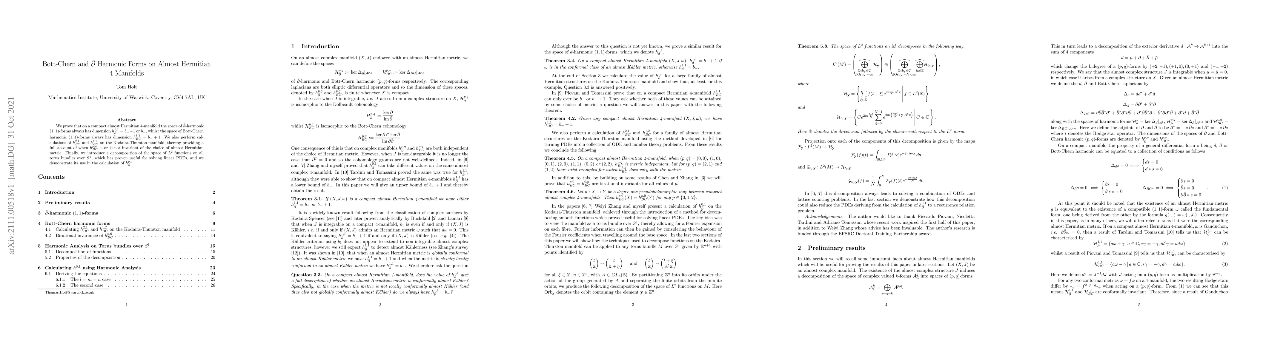 This research paper proves the dimensions of $\bar\partial$-harmonic and Bott-Chern harmonic $(1,1)$-forms on compact almost Hermitian 4-manifolds, showing that they depend on the manifold's $b_-$ characteristic. It also provides a complete account of $h^{p,q}_{BC}$ for the Kodaira-Thurston manifold and introduces a decomposition of $L^2$ functions on torus bundles for solving linear PDEs.