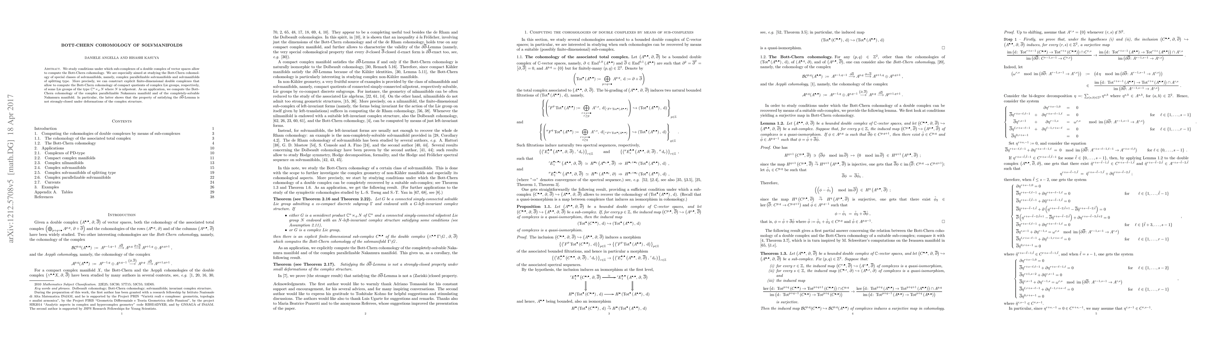This paper explores conditions for computing Bott-Chern cohomology using sub-complexes of double complexes, focusing on complex parallelizable solvmanifolds and solvmanifolds of splitting type. It constructs explicit finite-dimensional double complexes for compact quotients of complex Lie groups and certain Lie groups, demonstrating applications through the computation of Bott-Chern cohomology for the Nakamura manifold and revealing that the $\partial\overline\partial$-Lemma property is not strongly-closed under deformations of the complex structure.