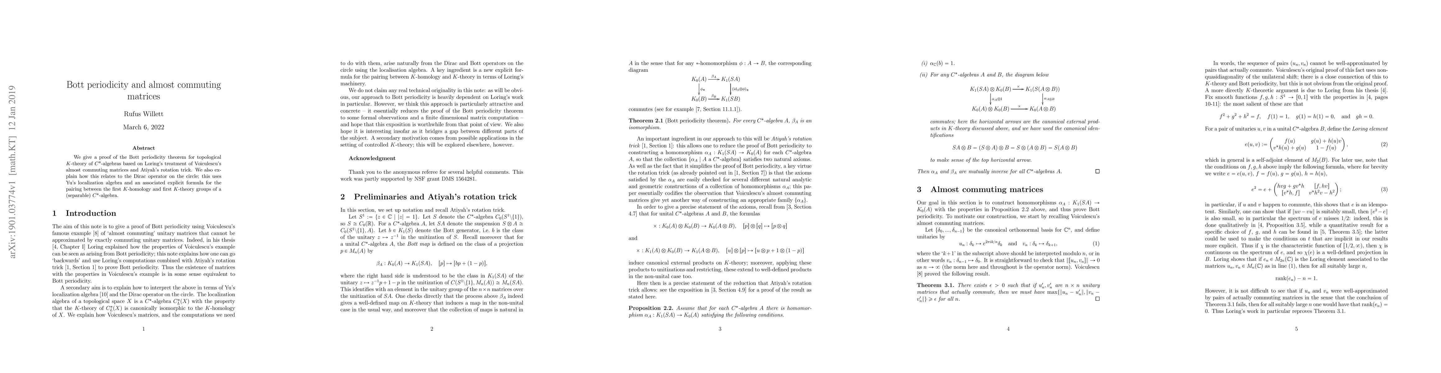 This paper proves Bott periodicity for topological K-theory of C*-algebras using Loring's approach to Voiculescu's almost commuting matrices and Atiyah's rotation trick, and connects this to the Dirac operator on the circle via Yu's localization algebra.