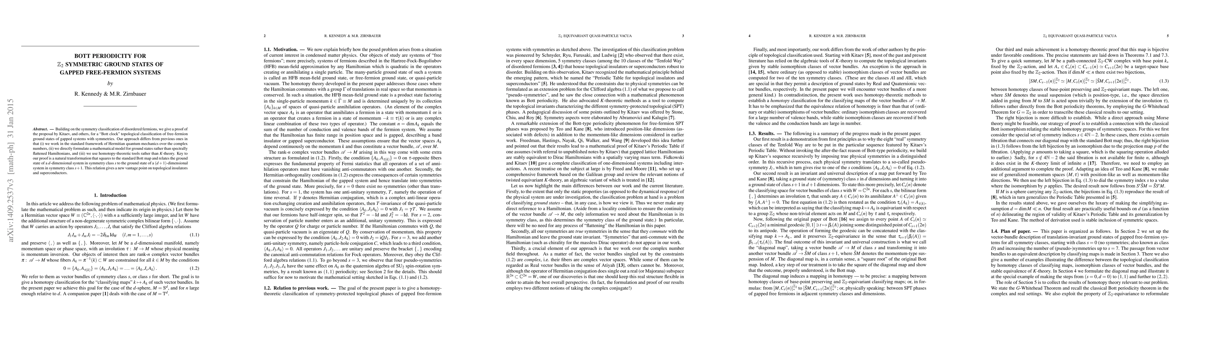 Building on the symmetry classification of disordered fermions, we give a proof of the proposal by Kitaev, and others, for a "Bott clock" topological classification of free-fermion ground states of gapped systems with symmetries. Our approach differs from previous ones in that (i) we work in the standard framework of Hermitian quantum mechanics over the complex numbers, (ii) we directly formulate a mathematical model for ground states rather than spectrally flattened Hamiltonians, and (iii) we use homotopy-theoretic tools rather than K-theory. Key to our proof is a natural transformation that squares to the standard Bott map and relates the ground state of a d-dimensional system in symmetry class s to the ground state of a (d+1)-dimensional system in symmetry class s+1. This relation gives a new vantage point on topological insulators and superconductors.