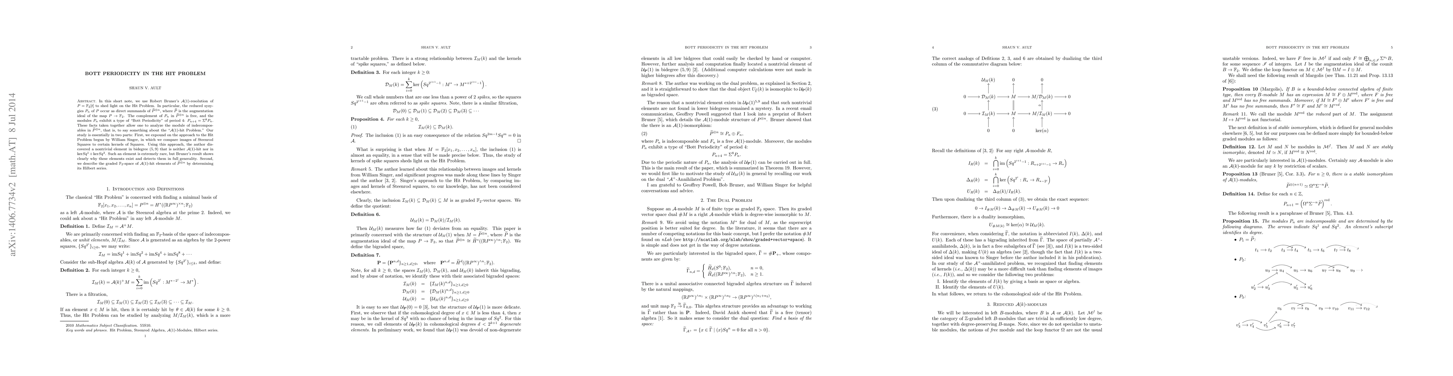 In this short note, we use Robert Bruner's $\mathcal{A}(1)$-resolution of $P = \mathbb{F}_2[t]$ to shed light on the Hit Problem. In particular, the reduced syzygies $P_n$ of $P$ occur as direct summands of $\widetilde{P}^{\otimes n}$, where $\widetilde{P}$ is the augmentation ideal of the map $P \to \mathbb{F}_2$. The complement of $P_n$ in $\widetilde{P}^{\otimes n}$ is free, and the modules $P_n$ exhibit a type of "Bott Periodicity" of period $4$: $P_{n+4} = \Sigma^8P_n$. These facts taken together allow one to analyze the module of indecomposables in $\widetilde{P}^{\otimes n}$, that is, to say something about the "$\mathcal{A}(1)$-hit Problem." Our study is essentially in two parts: First, we expound on the approach to the Hit Problem begun by William Singer, in which we compare images of Steenrod Squares to certain kernels of Squares. Using this approach, the author discovered a nontrivial element in bidegree $(5, 9)$ that is neither $\mathcal{A}(1)$-hit nor in $\mathrm{ker} Sq^1 + \mathrm{ker} Sq^3$. Such an element is extremely rare, but Bruner's result shows clearly why these elements exist and detects them in full generality. Second, we describe the graded $\mathbb{F}_2$-space of $\mathcal{A}(1)$-hit elements of $\widetilde{P}^{\otimes n}$ by determining its Hilbert series.