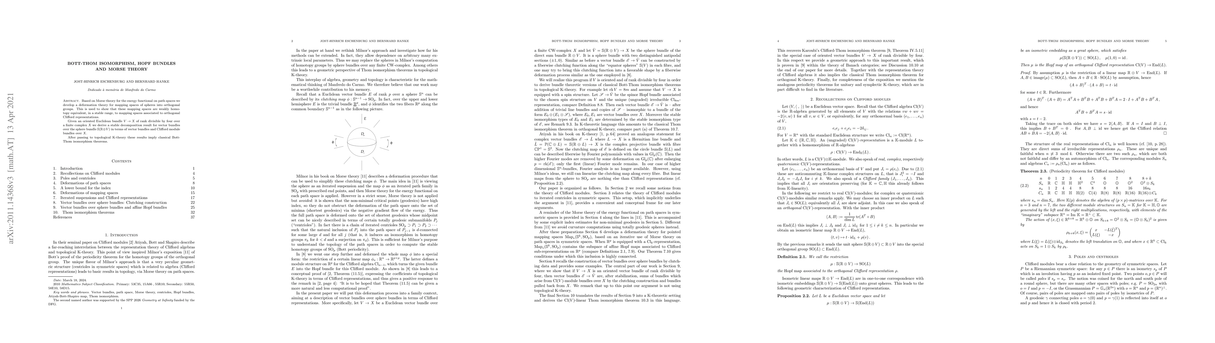 This paper develops a deformation theory based on Morse theory for path spaces, demonstrating that mapping spaces of spheres into orthogonal groups are weakly homotopy equivalent to spaces associated with orthogonal Clifford representations. It also derives a stable decomposition result for vector bundles over sphere bundles of certain Euclidean bundles, ultimately supporting classical Bott-Thom isomorphism theorems in topological K-theory.