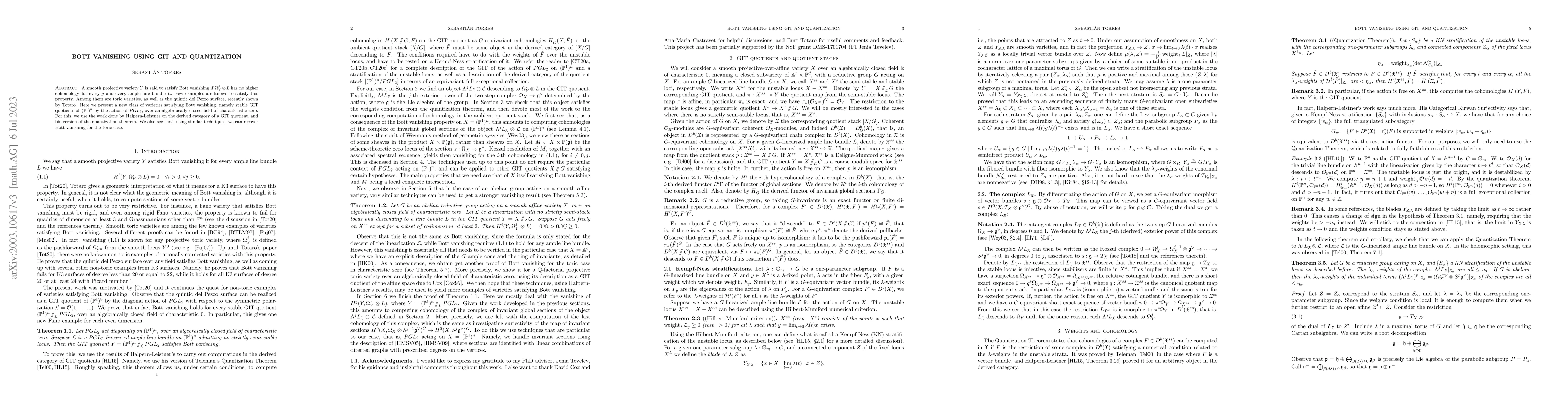 This paper introduces a new class of stable GIT quotients of $(\mathbb{P}^1)^n$ by $PGL_2$ that satisfy Bott vanishing, leveraging Halpern-Leistner's work on GIT quotients and quantization. It also extends Bott vanishing to the toric case using similar techniques.