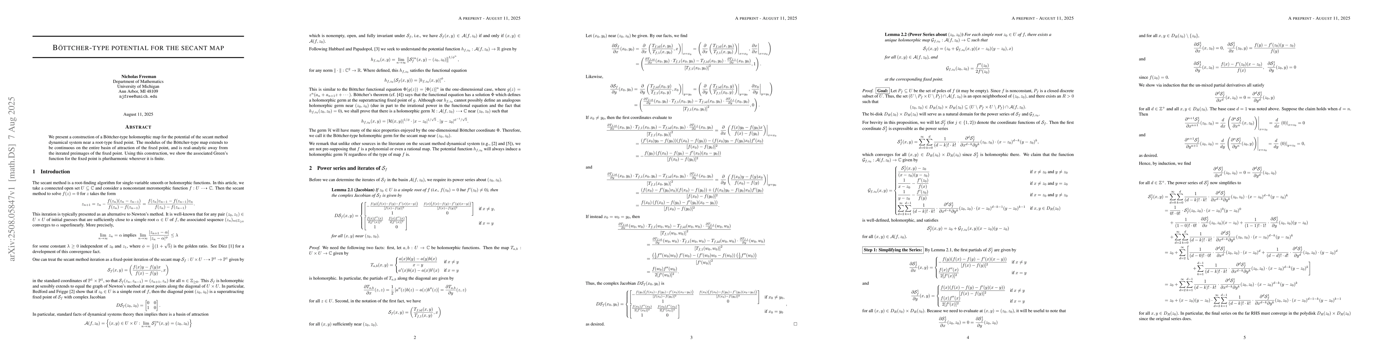 We present a construction of a B\"ottcher-type holomorphic map for the potential of the secant method dynamical system near a root-type fixed point. The modulus of the B\"ottcher-type map extends to be continuous on the entire basin of attraction of the fixed point, and is real-analytic away from the iterated preimages of the fixed point. Using this construction, we show the associated Green's function for the fixed point is pluriharmonic wherever it is finite.