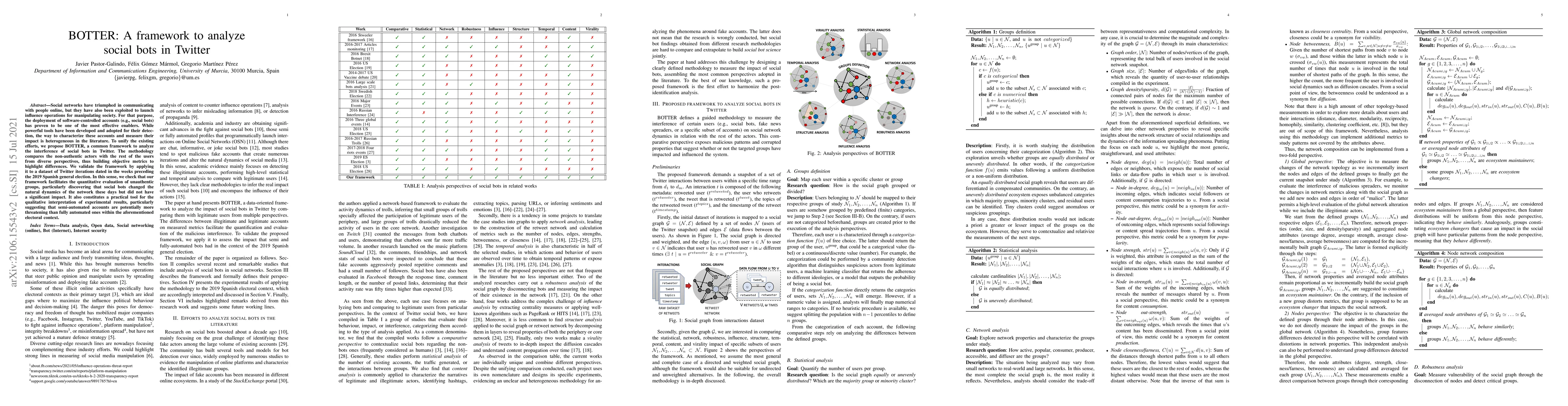 The paper introduces BOTTER, a unified framework for analyzing social bots on Twitter, aiming to provide consistent metrics for their impact. The framework was validated on Twitter data from the weeks leading up to the 2019 Spanish general election, revealing that social bots altered network dynamics but did not significantly influence the election.