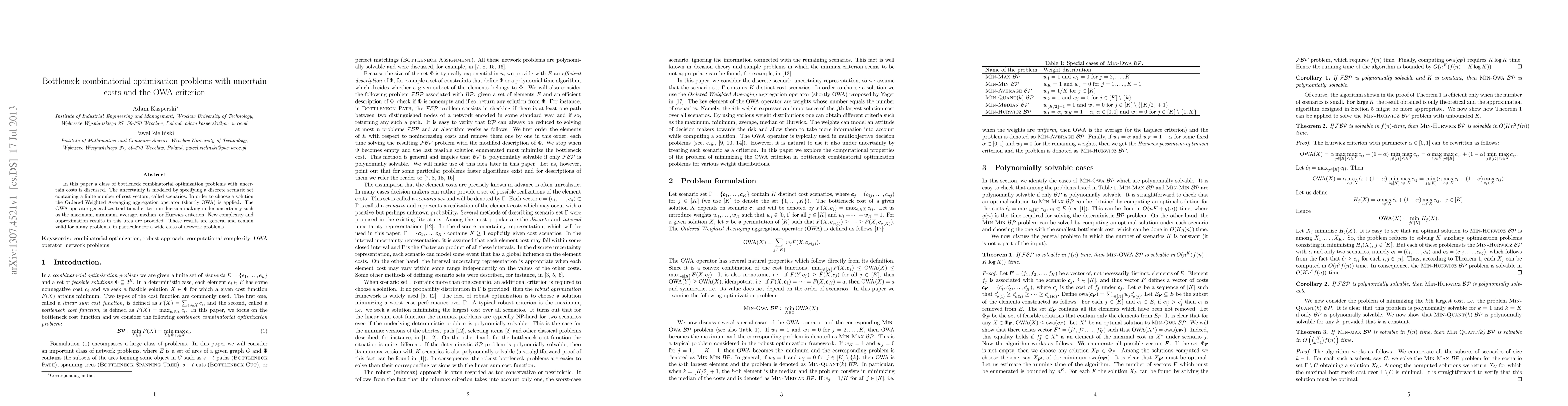 In this paper a class of bottleneck combinatorial optimization problems with uncertain costs is discussed. The uncertainty is modeled by specifying a discrete scenario set containing a finite number of cost vectors, called scenarios. In order to choose a solution the Ordered Weighted Averaging aggregation operator (shortly OWA) is applied. The OWA operator generalizes traditional criteria in decision making under uncertainty such as the maximum, minimum, average, median, or Hurwicz criterion. New complexity and approximation results in this area are provided. These results are general and remain valid for many problems, in particular for a wide class of network problems.