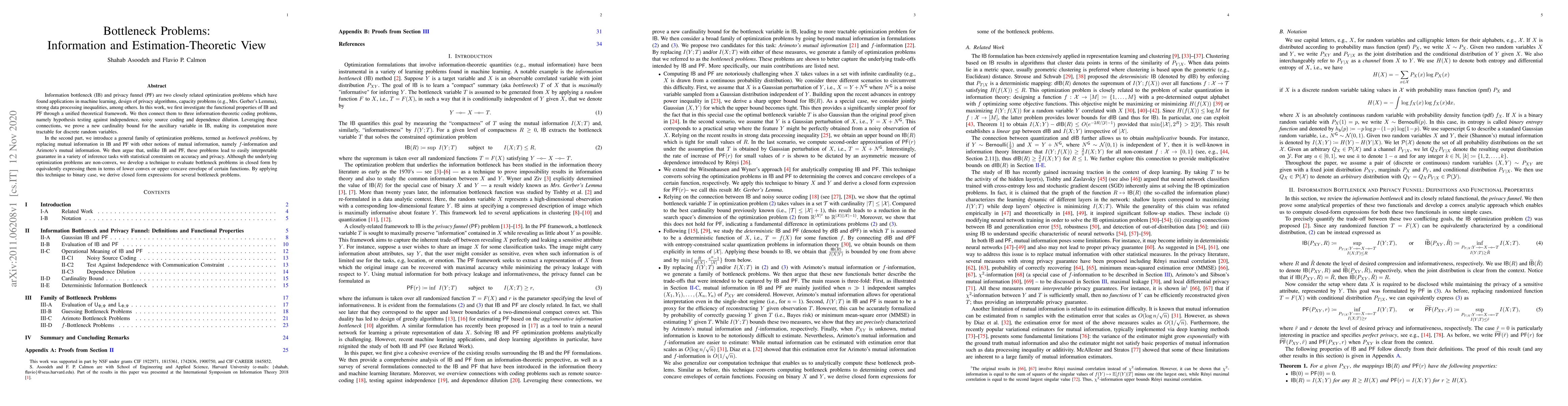 Information bottleneck (IB) and privacy funnel (PF) are two closely related optimization problems which have found applications in machine learning, design of privacy algorithms, capacity problems (e.g., Mrs. Gerber's Lemma), strong data processing inequalities, among others. In this work, we first investigate the functional properties of IB and PF through a unified theoretical framework. We then connect them to three information-theoretic coding problems, namely hypothesis testing against independence, noisy source coding and dependence dilution. Leveraging these connections, we prove a new cardinality bound for the auxiliary variable in IB, making its computation more tractable for discrete random variables. In the second part, we introduce a general family of optimization problems, termed as \textit{bottleneck problems}, by replacing mutual information in IB and PF with other notions of mutual information, namely $f$-information and Arimoto's mutual information. We then argue that, unlike IB and PF, these problems lead to easily interpretable guarantee in a variety of inference tasks with statistical constraints on accuracy and privacy. Although the underlying optimization problems are non-convex, we develop a technique to evaluate bottleneck problems in closed form by equivalently expressing them in terms of lower convex or upper concave envelope of certain functions. By applying this technique to binary case, we derive closed form expressions for several bottleneck problems.