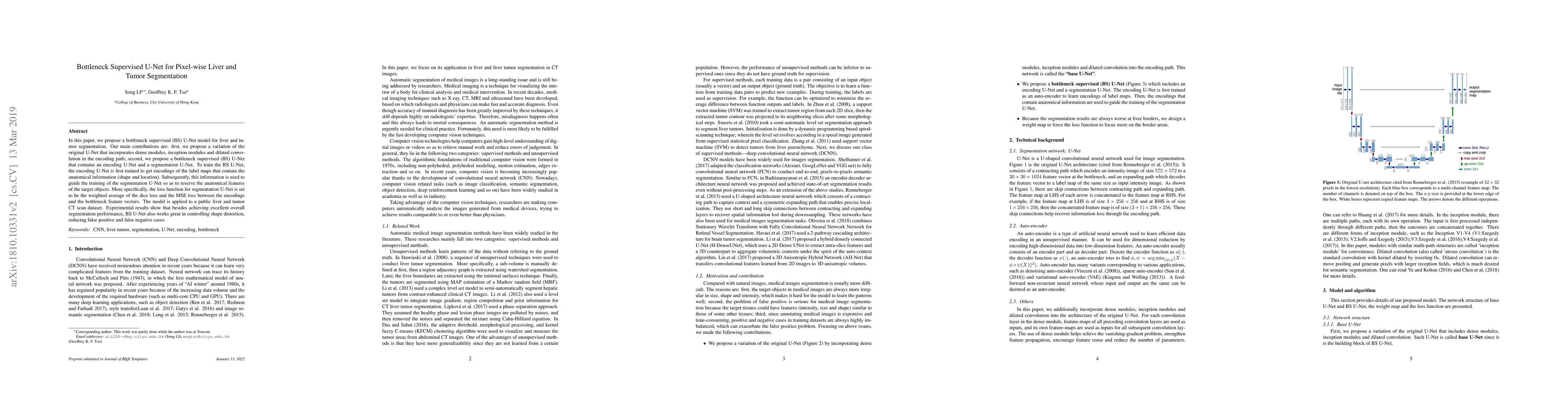 This paper introduces a bottleneck supervised U-Net model for liver and tumor segmentation in CT scans, incorporating dense, inception, and dilated convolution modules. The model trains an encoding U-Net first to capture anatomical features, which guides the segmentation U-Net to preserve these features, achieving superior segmentation performance and reducing shape distortion.