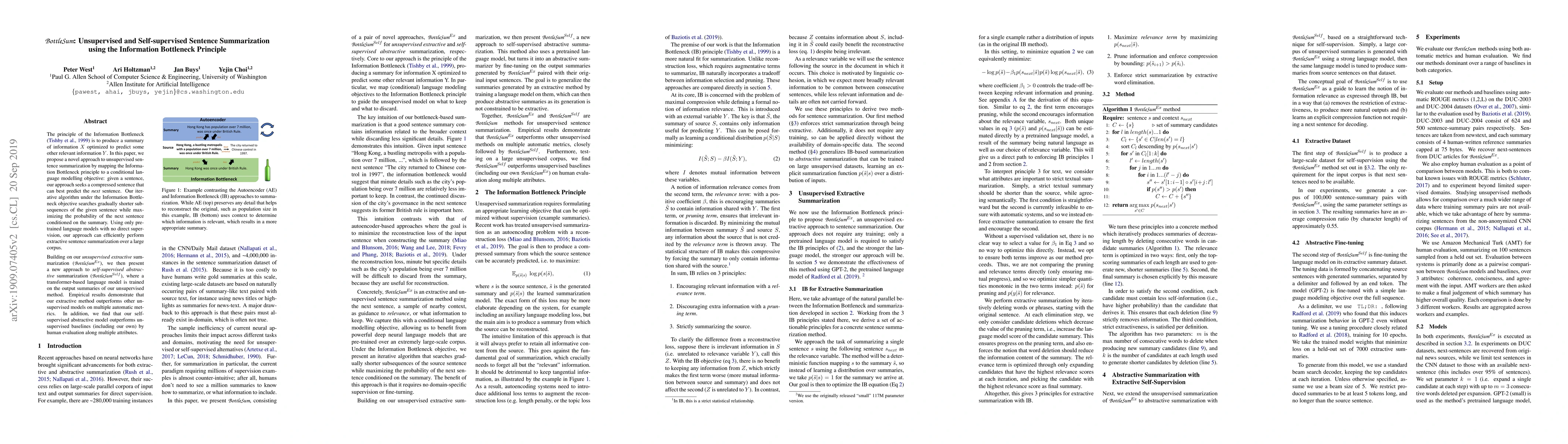 This paper proposes BottleSum, an unsupervised and self-supervised sentence summarization method based on the Information Bottleneck principle. It efficiently performs extractive summarization without direct supervision and introduces a self-supervised abstractive summarization approach that outperforms unsupervised baselines in human evaluations.