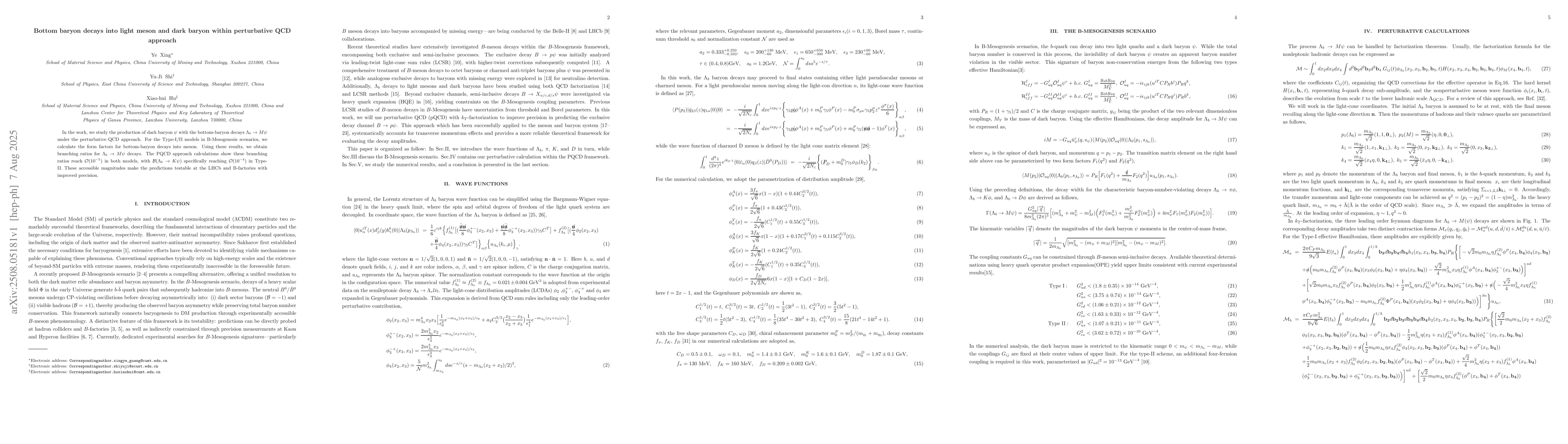 This research uses the perturbative QCD approach to study bottom baryon decays into light mesons and hypothetical dark baryons. It calculates form factors for bottom-baryon decays into mesons in Type-I/II B-Mesogenesis models, predicting branching ratios for $Lambda_b o M psi$ decays of $mathcal{O}(10^{-5})$. Notably, $Lambda_b o Kpsi$ branching ratio reaches $mathcal{O}(10^{-4})$ in Type-II, making these predictions testable at LHCb and B-factories.