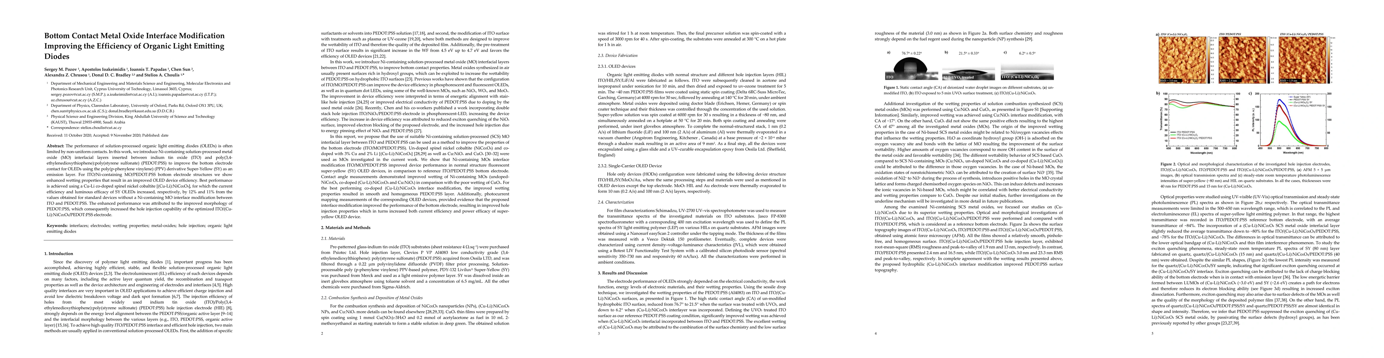 The performance of solution-processed organic light emitting diodes (OLEDs) is often limited by non-uniform contacts. In this work, we introduce Ni-containing solution-processed metal oxide (MO) interfacial layers inserted between indium tin oxide (ITO) and poly(3,4-ethylenedioxythiophene):poly(styrene sulfonate) (PEDOT:PSS) to improve the bottom electrode contact for OLEDs using the poly(p-phenylene vinylene) (PPV) derivative Super-Yellow (SY) as an emission layer. For ITO/Ni-containing MO/PEDOT:PSS bottom electrode structures we show enhanced wetting properties that result in an improved OLED device efficiency. Best performance is achieved using a Cu-Li co-doped spinel nickel cobaltite [(Cu-Li):NiCo2O4], for which the current efficiency and luminous efficacy of SY OLEDs increased, respectively, by 12% and 11% from the values obtained for standard devices without a Ni-containing MO interface modification between ITO and PEDOT:PSS. The enhanced performance was attributed to the improved morphology of PEDOT:PSS, which consequently increased the hole injection capability of the optimized ITO/(Cu-Li):NiCo2O4/PEDOT:PSS electrode.