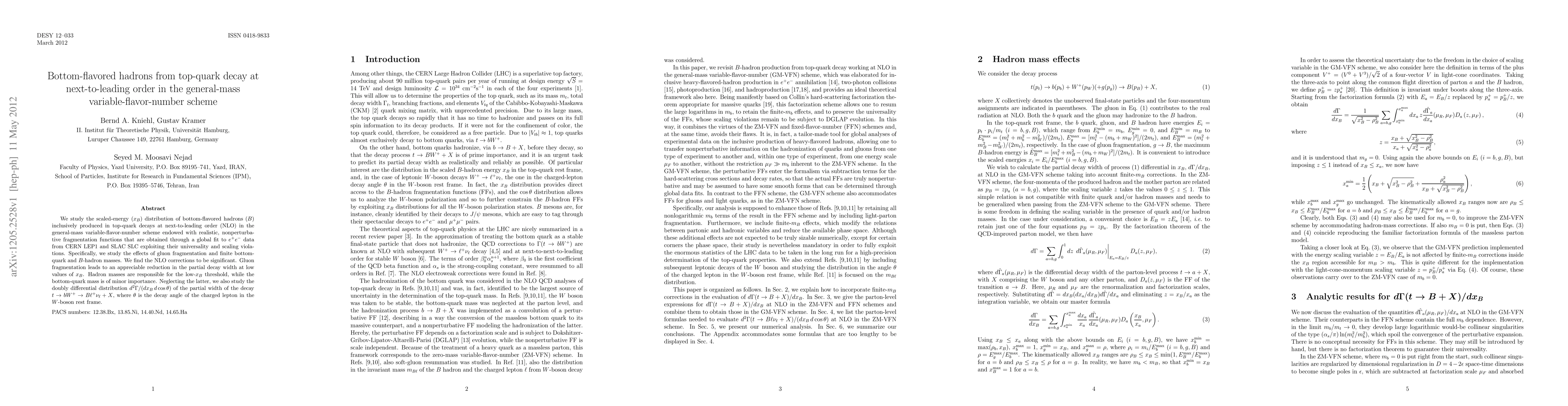 Researchers studied top-quark decay at next-to-leading order in a variable-flavor-number scheme, finding significant NLO corrections that depend on gluon fragmentation and hadron masses. The results have implications for understanding the properties of bottom-flavored hadrons produced in high-energy collisions.