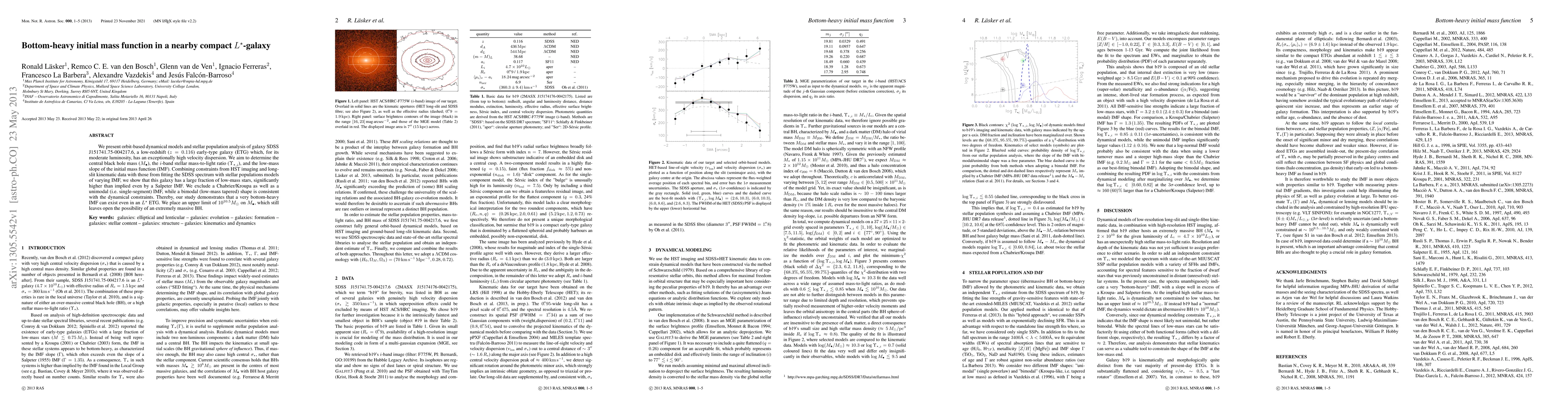 This study reveals that the compact L*-galaxy SDSS J151741.75-004217.6 exhibits a bottom-heavy initial mass function (IMF) with a significant fraction of low-mass stars, challenging traditional unimodal IMF models. The galaxy's black hole mass is constrained to be less than ~10^{10.5}M_sun.
