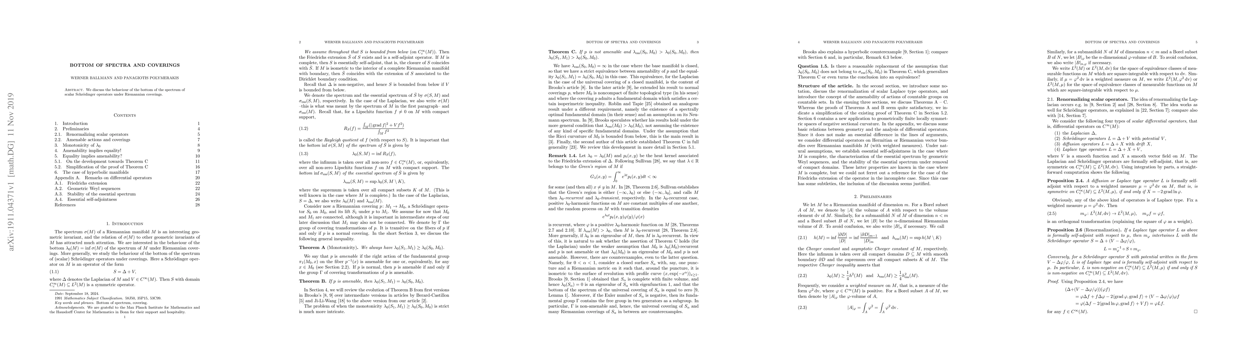 We discuss the behaviour of the bottom of the spectrum of scalar Schr\"odinger operators under Riemannian coverings.