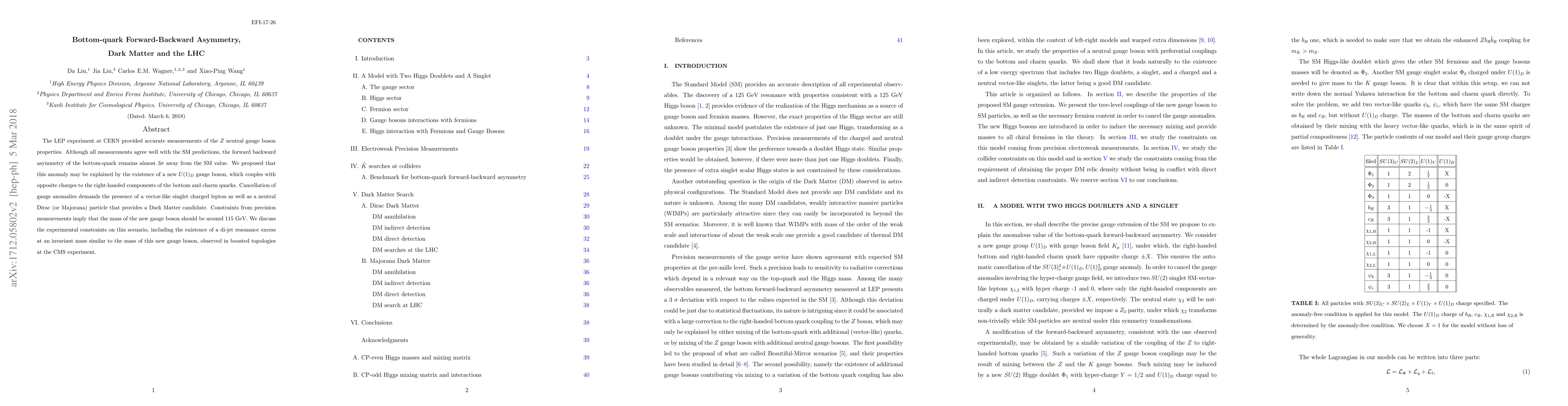 The LEP experiment at CERN provided accurate measurements of the $Z$ neutral gauge boson properties. Although all measurements agree well with the SM predictions, the forward backward asymmetry of the bottom-quark remains almost 3$\sigma$ away from the SM value. We proposed that this anomaly may be explained by the existence of a new $U(1)_D$ gauge boson, which couples with opposite charges to the right-handed components of the bottom and charm quarks. Cancellation of gauge anomalies demands the presence of a vector-like singlet charged lepton as well as a neutral Dirac (or Majorana) particle that provides a Dark Matter candidate. Constraints from precision measurements imply that the mass of the new gauge boson should be around $115$~GeV. We discuss the experimental constraints on this scenario, including the existence of a di-jet resonance excess at an invariant mass similar to the mass of this new gauge boson, observed in boosted topologies at the CMS experiment.