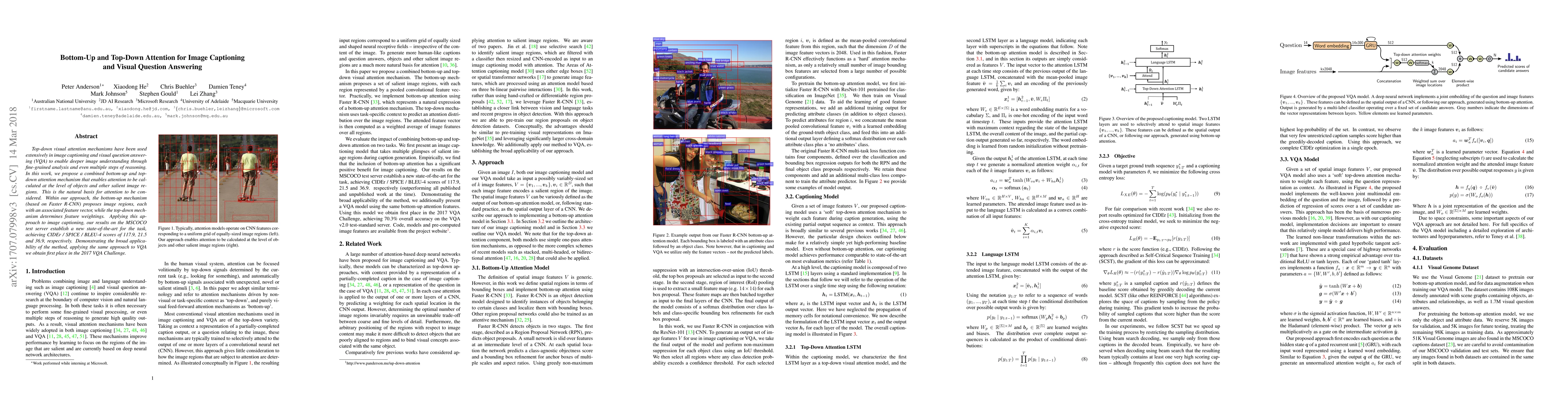 This paper proposes a combined bottom-up and top-down attention mechanism for image captioning and visual question answering, achieving state-of-the-art results on both tasks by leveraging object-level attention and fine-grained reasoning.