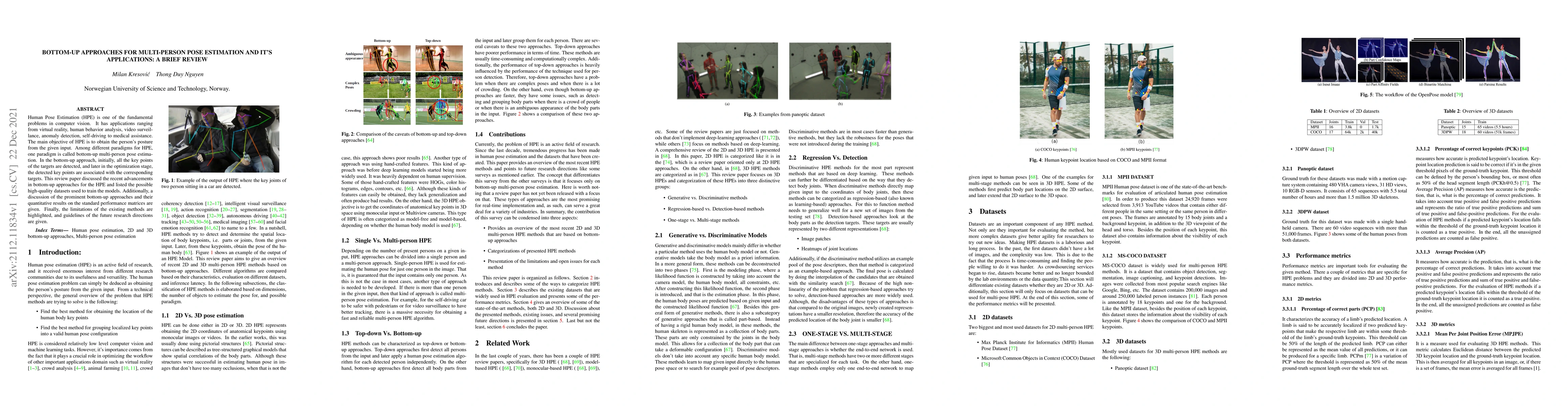 This review paper surveys recent advancements in bottom-up multi-person pose estimation, detailing key detection and optimization techniques, and evaluates prominent methods against standard performance metrics. It also outlines future research directions and highlights existing limitations.