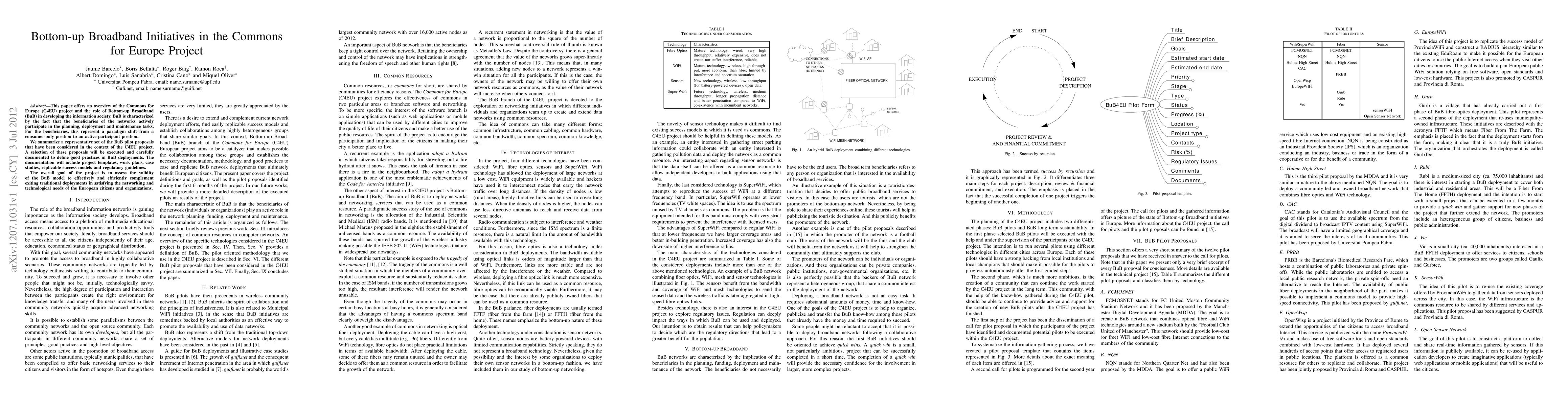 This paper offers an overview of the Commons for Europe (C4EU) project and the role of Bottom-up Broadband (BuB) in developing the information society. BuB is characterized by the fact that the beneficiaries of the networks actively participate in the planning, deployment and maintenance tasks. For the beneficiaries, this represent a paradigm shift from a consumer-only position to an active-participant position. We summarize a representative set of the BuB pilot proposals that have been considered in the context of the C4EU project. A selection of these proposals will be executed and carefully documented to define good practices in BuB deployments. The documentation will include project templates, work plans, case studies, replicable success models and regulatory guidelines. The overall goal of the project is to assess the validity of the BuB model to effectively and efficiently complement exiting traditional deployments in satisfying the networking and technological needs of the European citizens and organizations.