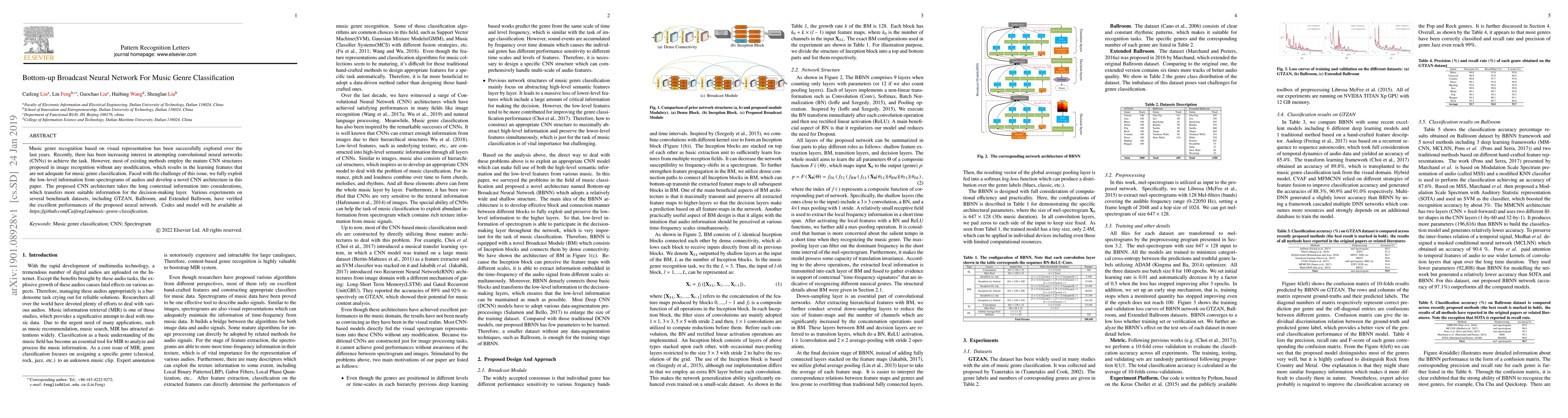 Music genre recognition based on visual representation has been successfully explored over the last years. Recently, there has been increasing interest in attempting convolutional neural networks (CNNs) to achieve the task. However, most of existing methods employ the mature CNN structures proposed in image recognition without any modification, which results in the learning features that are not adequate for music genre classification. Faced with the challenge of this issue, we fully exploit the low-level information from spectrograms of audios and develop a novel CNN architecture in this paper. The proposed CNN architecture takes the long contextual information into considerations, which transfers more suitable information for the decision-making layer. Various experiments on several benchmark datasets, including GTZAN, Ballroom, and Extended Ballroom, have verified the excellent performances of the proposed neural network. Codes and model will be available at "ttps://github.com/CaifengLiu/music-genre-classification".