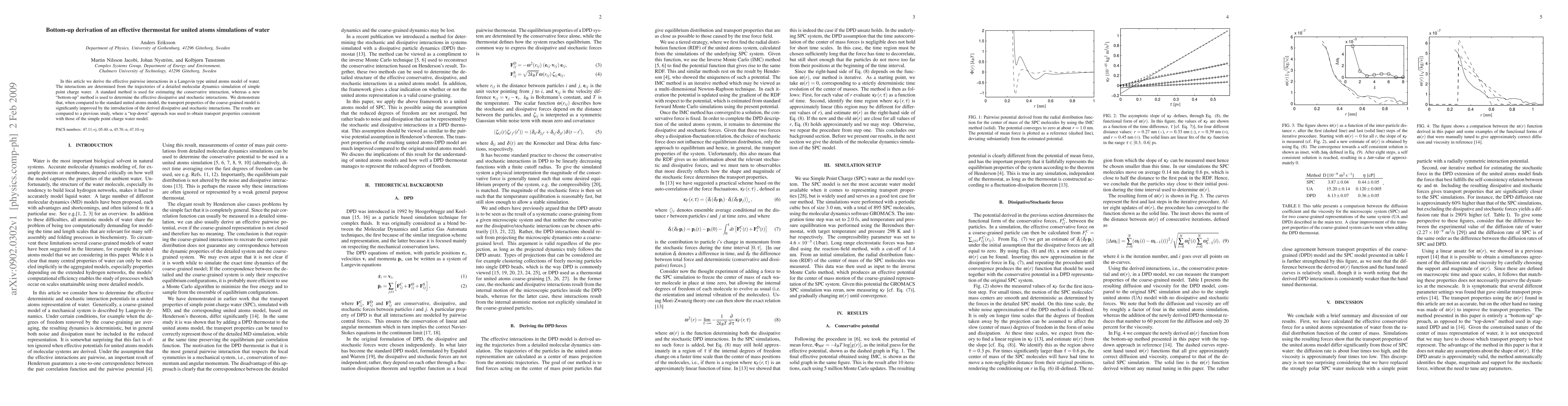 In this article we derive the effective pairwise interactions in a Langevin type united atoms model of water. The interactions are determined from the trajectories of a detailed molecular dynamics simulation of simple point charge water. A standard method is used for estimating the conservative interaction, whereas a new "bottom-up" method is used to determine the effective dissipative and stochastic interactions. We demonstrate that, when compared to the standard united atoms model, the transport properties of the coarse-grained model is significantly improved by the introduction of the derived dissipative and stochastic interactions. The results are compared to a previous study, where a "top-down" approach was used to obtain transport properties consistent with those of the simple point charge water model.