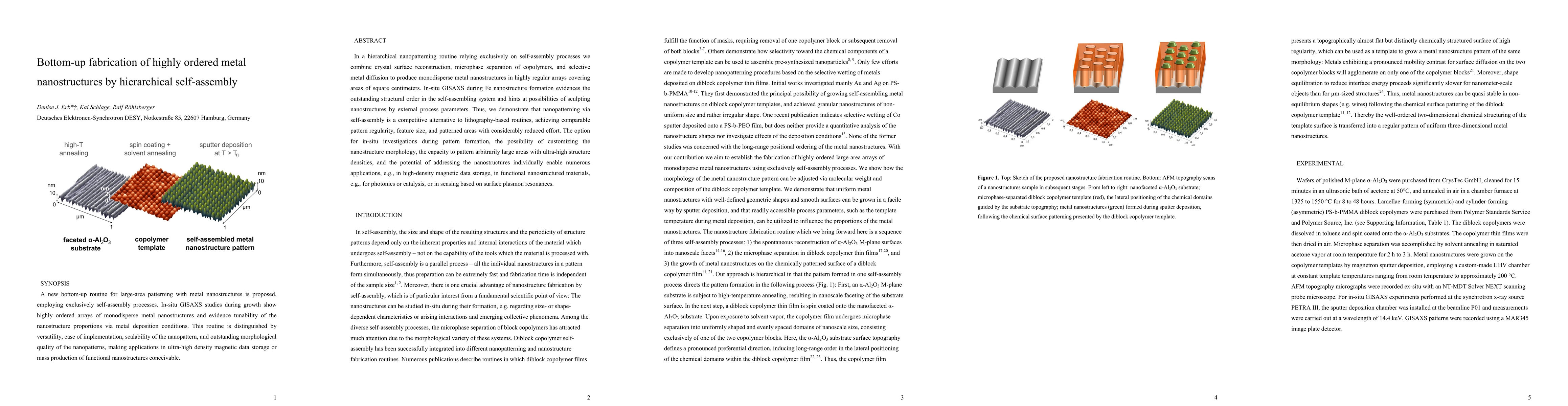 This paper details a bottom-up fabrication method using hierarchical self-assembly to create highly ordered metal nanostructures, demonstrating comparable pattern regularity and feature size to lithography with reduced effort. The method allows for in-situ investigations and customization of nanostructures, enabling applications in data storage, photonics, catalysis, and sensing.