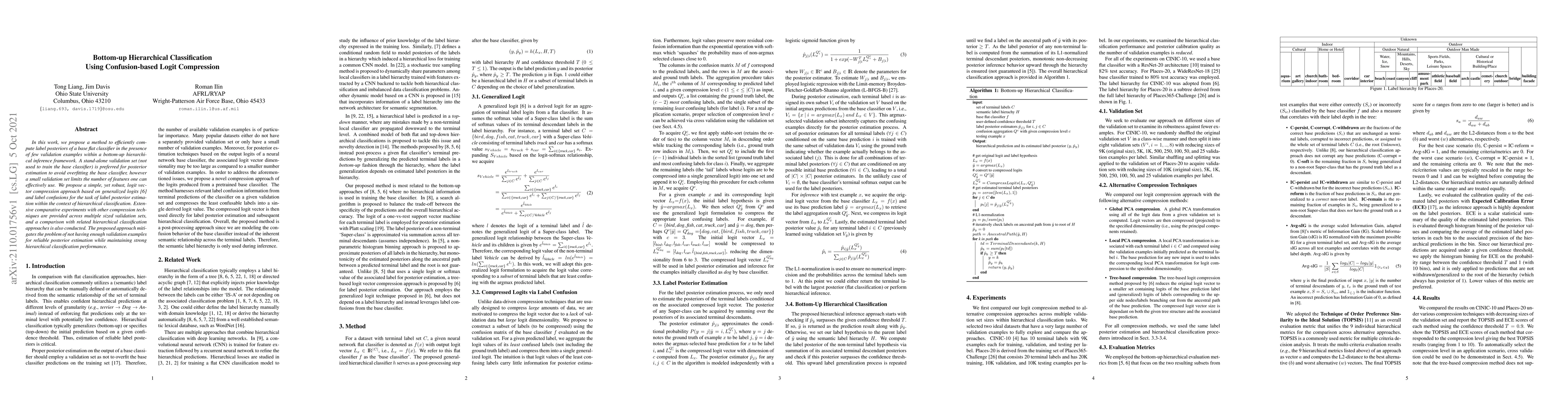 The paper proposes a bottom-up hierarchical classification method using confusion-based logit compression, which efficiently computes label posteriors of a base flat classifier with limited validation examples.