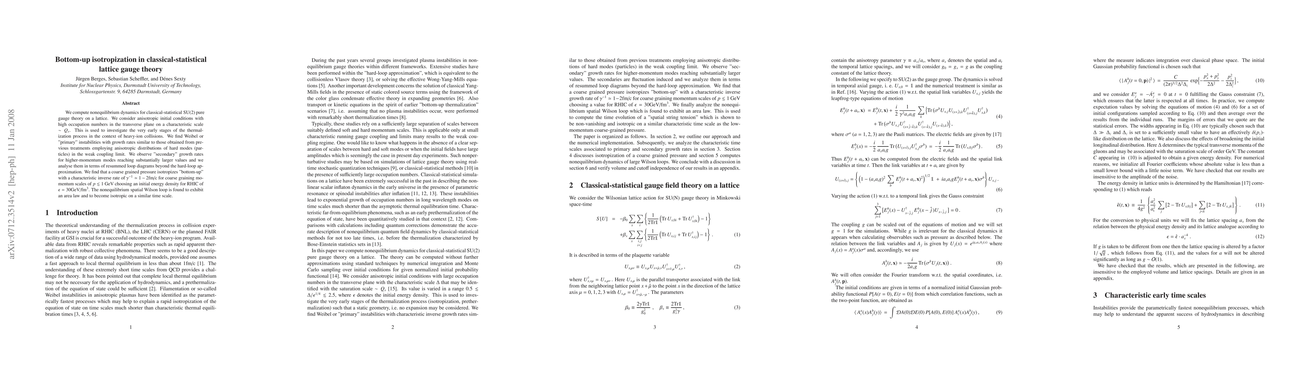 We compute nonequilibrium dynamics for classical-statistical SU(2) pure gauge theory on a lattice. We consider anisotropic initial conditions with high occupation numbers in the transverse plane on a characteristic scale ~ Q_s. This is used to investigate the very early stages of the thermalization process in the context of heavy-ion collisions. We find Weibel or "primary" instabilities with growth rates similar to those obtained from previous treatments employing anisotropic distributions of hard modes (particles) in the weak coupling limit. We observe "secondary" growth rates for higher-momentum modes reaching substantially larger values and we analyse them in terms of resummed loop diagrams beyond the hard-loop approximation. We find that a coarse grained pressure isotropizes "bottom-up" with a characteristic inverse rate of gamma^{-1} ~ 1 - 2 fm/c for coarse graining momentum scales of p < 1 GeV choosing an initial energy density for RHIC of epsilon = 30 GeV/fm^3. The nonequilibrium spatial Wilson loop is found to exhibit an area law and to become isotropic on a similar time scale.