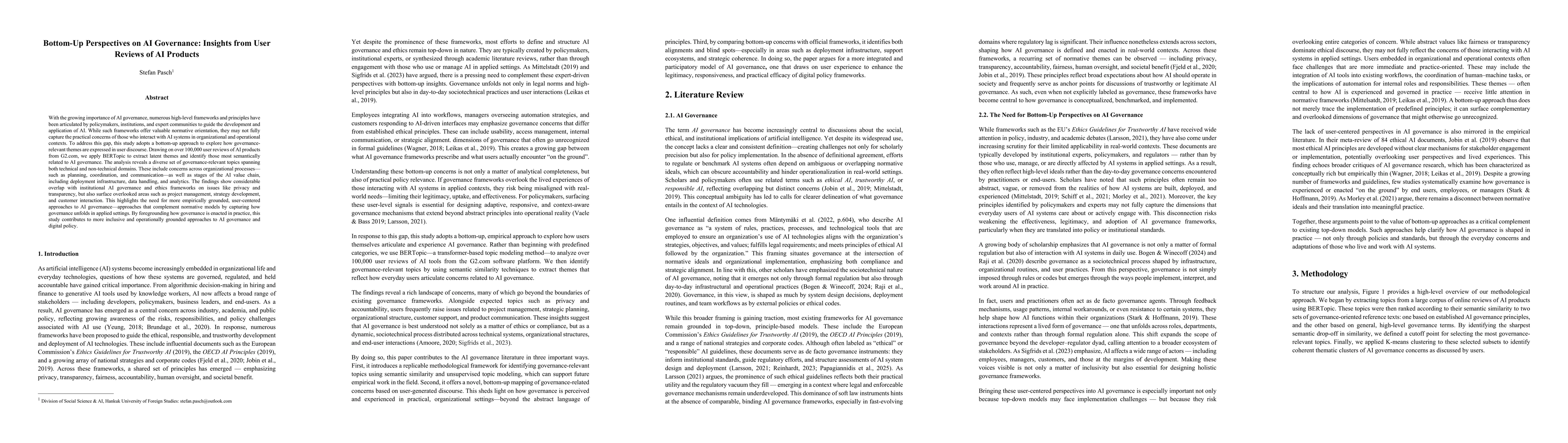 The application of BERTopic for theme extraction from large-scale user reviews contributes a novel method for identifying governance-related themes in AI product usage contexts.