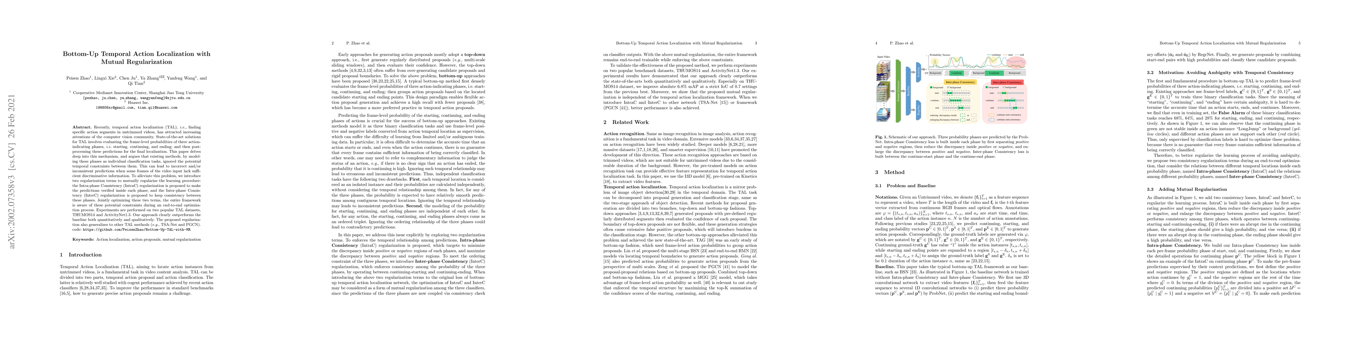 Recently, temporal action localization (TAL), i.e., finding specific action segments in untrimmed videos, has attracted increasing attentions of the computer vision community. State-of-the-art solutions for TAL involves evaluating the frame-level probabilities of three action-indicating phases, i.e. starting, continuing, and ending; and then post-processing these predictions for the final localization. This paper delves deep into this mechanism, and argues that existing methods, by modeling these phases as individual classification tasks, ignored the potential temporal constraints between them. This can lead to incorrect and/or inconsistent predictions when some frames of the video input lack sufficient discriminative information. To alleviate this problem, we introduce two regularization terms to mutually regularize the learning procedure: the Intra-phase Consistency (IntraC) regularization is proposed to make the predictions verified inside each phase; and the Inter-phase Consistency (InterC) regularization is proposed to keep consistency between these phases. Jointly optimizing these two terms, the entire framework is aware of these potential constraints during an end-to-end optimization process. Experiments are performed on two popular TAL datasets, THUMOS14 and ActivityNet1.3. Our approach clearly outperforms the baseline both quantitatively and qualitatively. The proposed regularization also generalizes to other TAL methods (e.g., TSA-Net and PGCN). code: https://github.com/PeisenZhao/Bottom-Up-TAL-with-MR