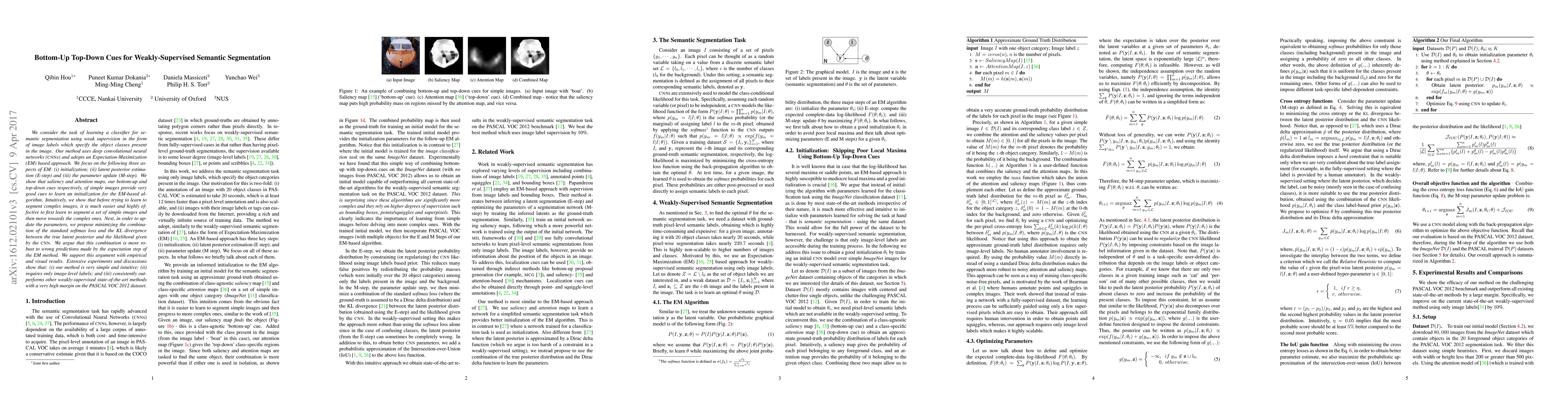 This research paper proposes a method for weakly-supervised semantic segmentation using deep convolutional neural networks and an Expectation-Maximization approach. It leverages bottom-up cues like saliency maps and top-down attention maps to initialize the algorithm, followed by parameter updates that combine softmax loss and KL divergence. The method demonstrates superior performance over other state-of-the-art techniques using only image-level labels.