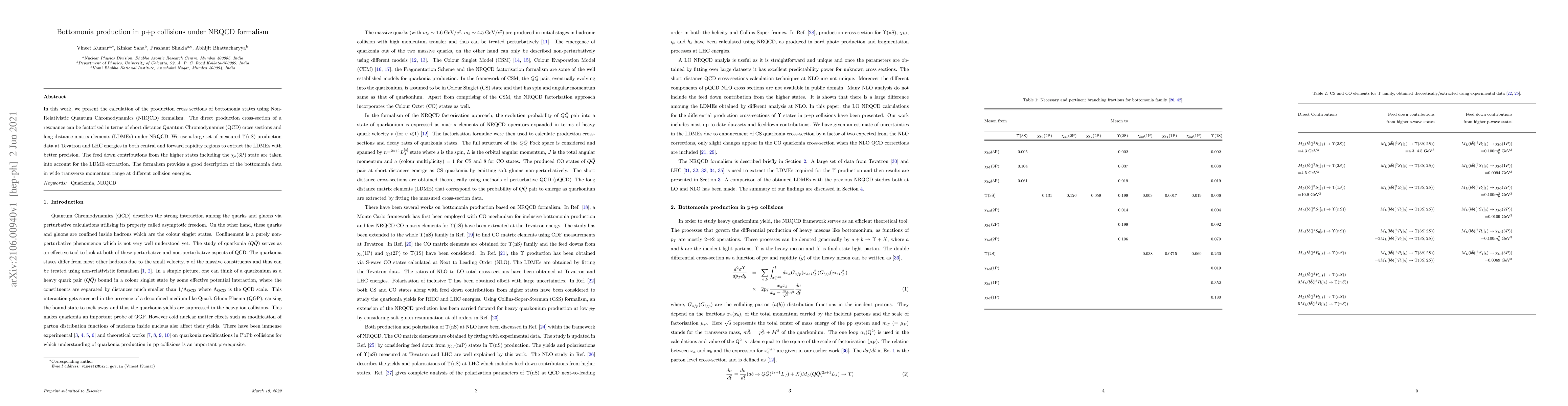 In this work, we present the calculation of the production cross sections of bottomonia states using Non-Relativistic Quantum Chromodynamics (NRQCD) formalism. The direct production cross-section of a resonance can be factorised in terms of short distance Quantum Chromodynamics (QCD) cross sections and long distance matrix elements (LDMEs) under NRQCD. We use a large set of measured $\Upsilon$(nS) production data at Tevatron and LHC energies in both central and forward rapidity regions to extract the LDMEs with better precision. The feed down contributions from the higher states including the $\chi_{b}$(3P) state are taken into account for the LDME extraction. The formalism provides a good description of the bottomonia data in wide transverse momentum range at different collision energies.