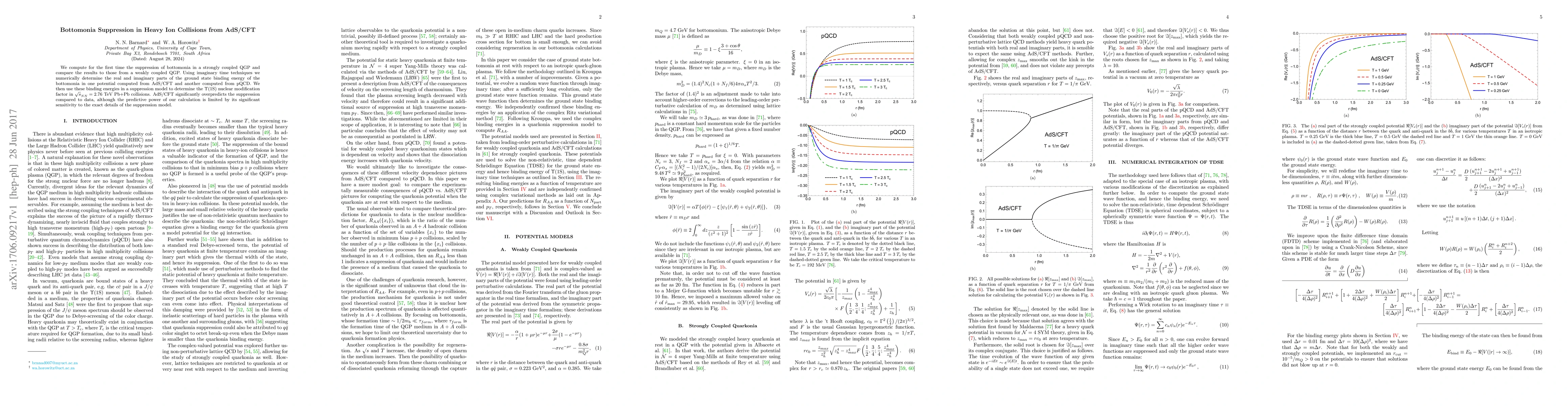 The study computes bottomonia suppression in a strongly coupled QGP using AdS/CFT and compares it to a weakly coupled QGP, determining the Υ(1S) nuclear modification factor in √sNN=2.76 TeV Pb+Pb collisions via imaginary time techniques and numerical determination of real and imaginary parts of the ground state binding energy.