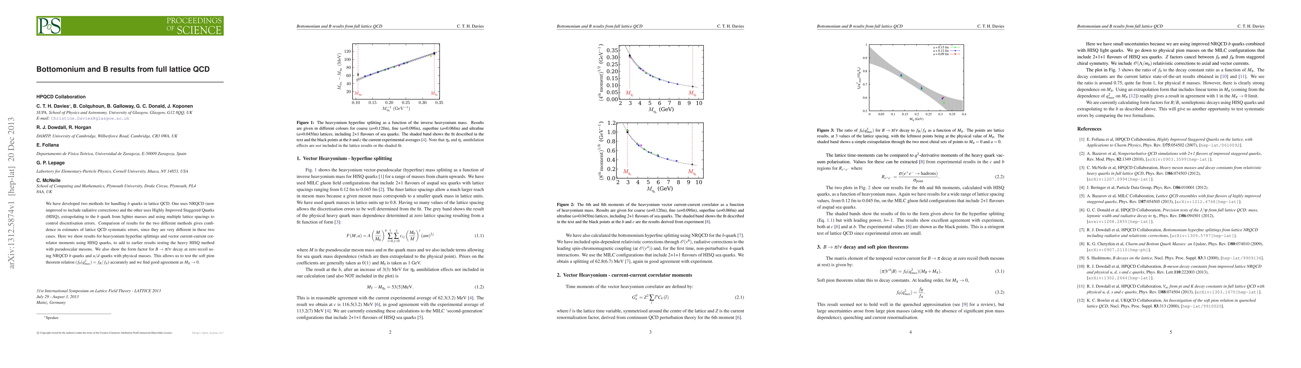 We have developed two methods for handling $b$ quarks in lattice QCD. One uses NRQCD (now improved to include radiative corrections) and the other uses Highly Improved Staggered Quarks (HISQ), extrapolating to the $b$ quark from lighter masses and using multiple lattice spacings to control discretisation errors. Comparison of results for the two different methods gives confidence in estimates of lattice QCD systematic errors, since they are very different in these two cases. Here we show results for heavyonium hyperfine splittings and vector current-current correlator moments using HISQ quarks, to add to earlier results testing the heavy HISQ method with pseudoscalar mesons. We also show the form factor for $B \rightarrow \pi l \nu$ decay at zero recoil using NRQCD $b$ quarks and $u/d$ quarks with physical masses. This allows us to test the soft pion theorem relation ($f_0(q^2_{max})=f_B/f_{\pi}$) accurately and we find good agreement as $M_{\pi} \rightarrow 0$. }