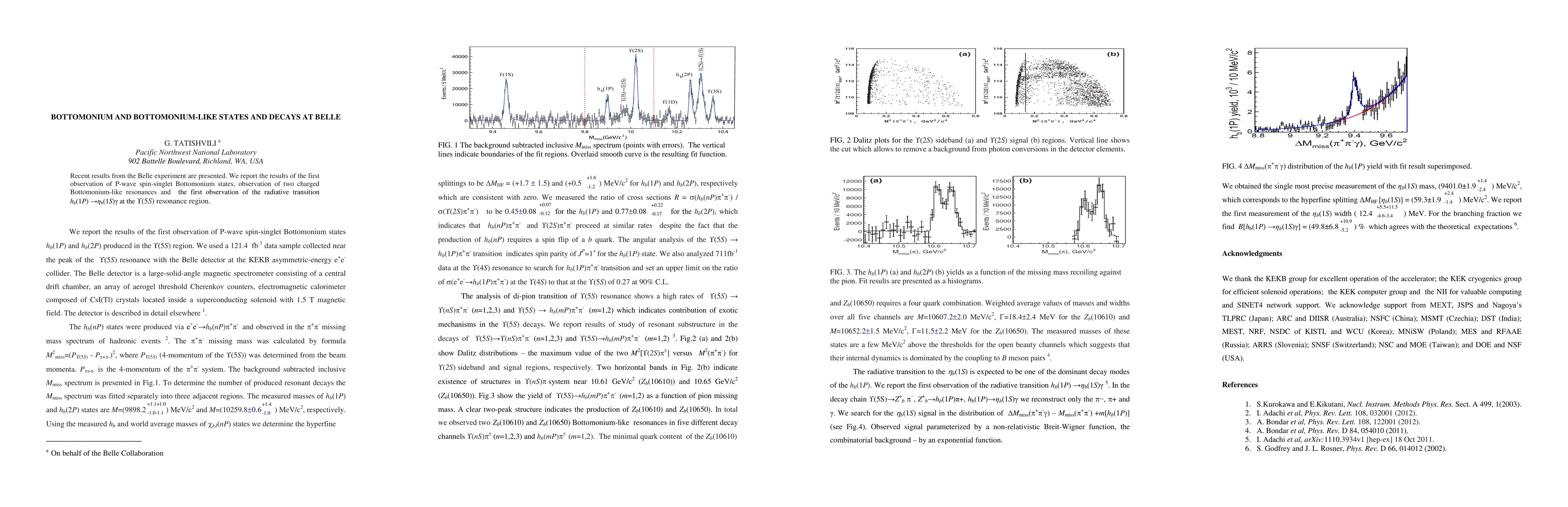 The Belle experiment presents the first observation of P-wave spin-singlet Bottomonium states and two charged Bottomonium-like resonances. Additionally, it reports the first observation of the radiative transition hb(1P)→ηb(1S)γ at the Y(5S) resonance region.
